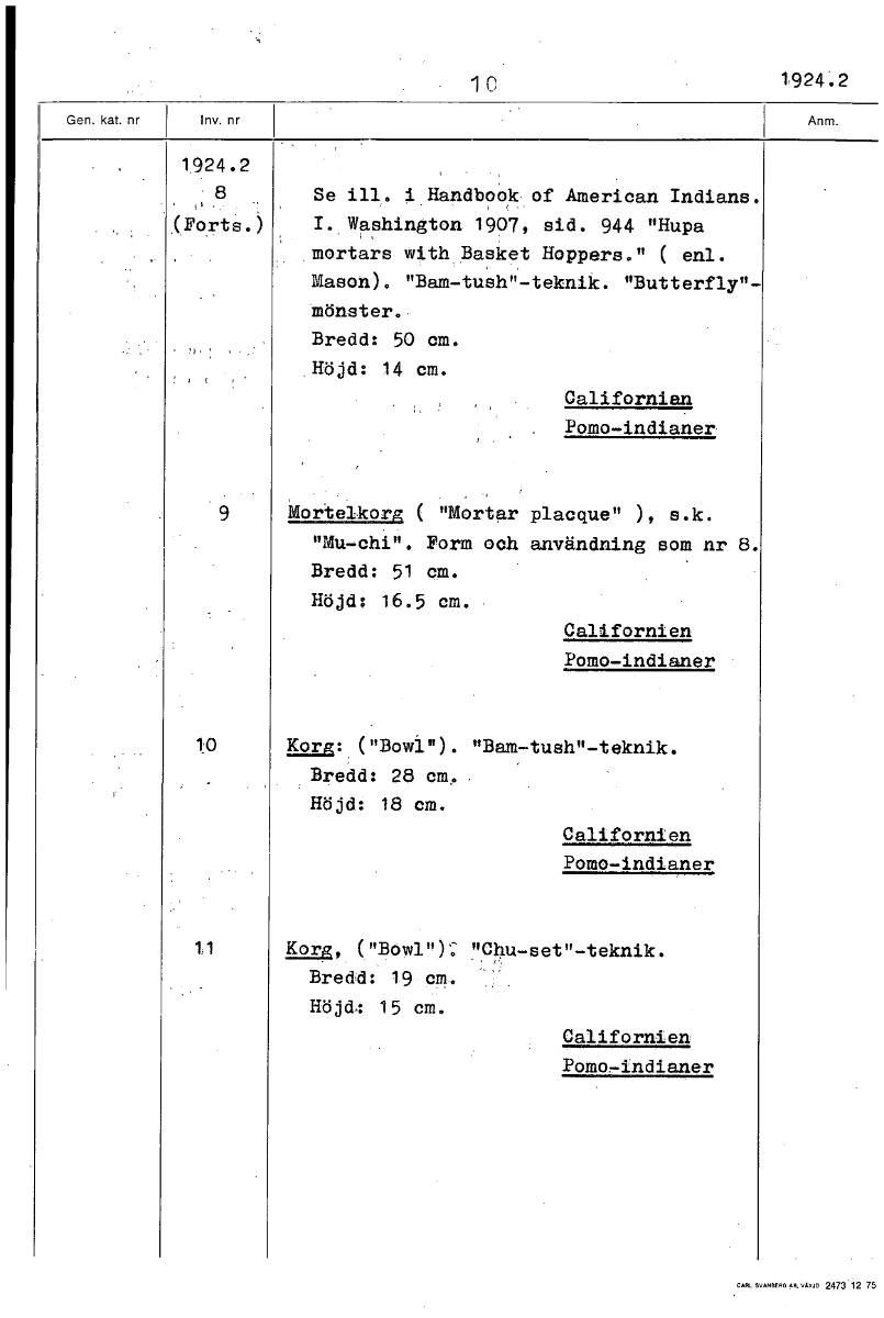 lo 1924.2 1924.2 8 Se ill. i Handbook of American Indians. , (Forts.) I. Washington 1907, sid. 944 "Huga mortas with Basket Hoppers." ( enl. Mason). "Bam-tush"-teknik. "Butterfly"- mönster. Bredd: 50 cm. Höjd: 14 cm. Californien Pomo-indianer Mortelkorg ( "Mortar placque" ), s.k. "Mu-chi". Form och användning som nr 8. Bredd: 51 cm. Höjd: 16.5 cm. Californien Pomo-indianer 10 Korg: ("Bowl"). "Bam-tush"-teknik. Bredd: 28 cm. Höjd: 18 cm. Californien Pomo-indianer Korg, ("Bowl")': "Chu-set"-teknik. Bredd: 19 cm. Höjd: 15 cm. Californien Pomo-indianer [ocr]Stäng
