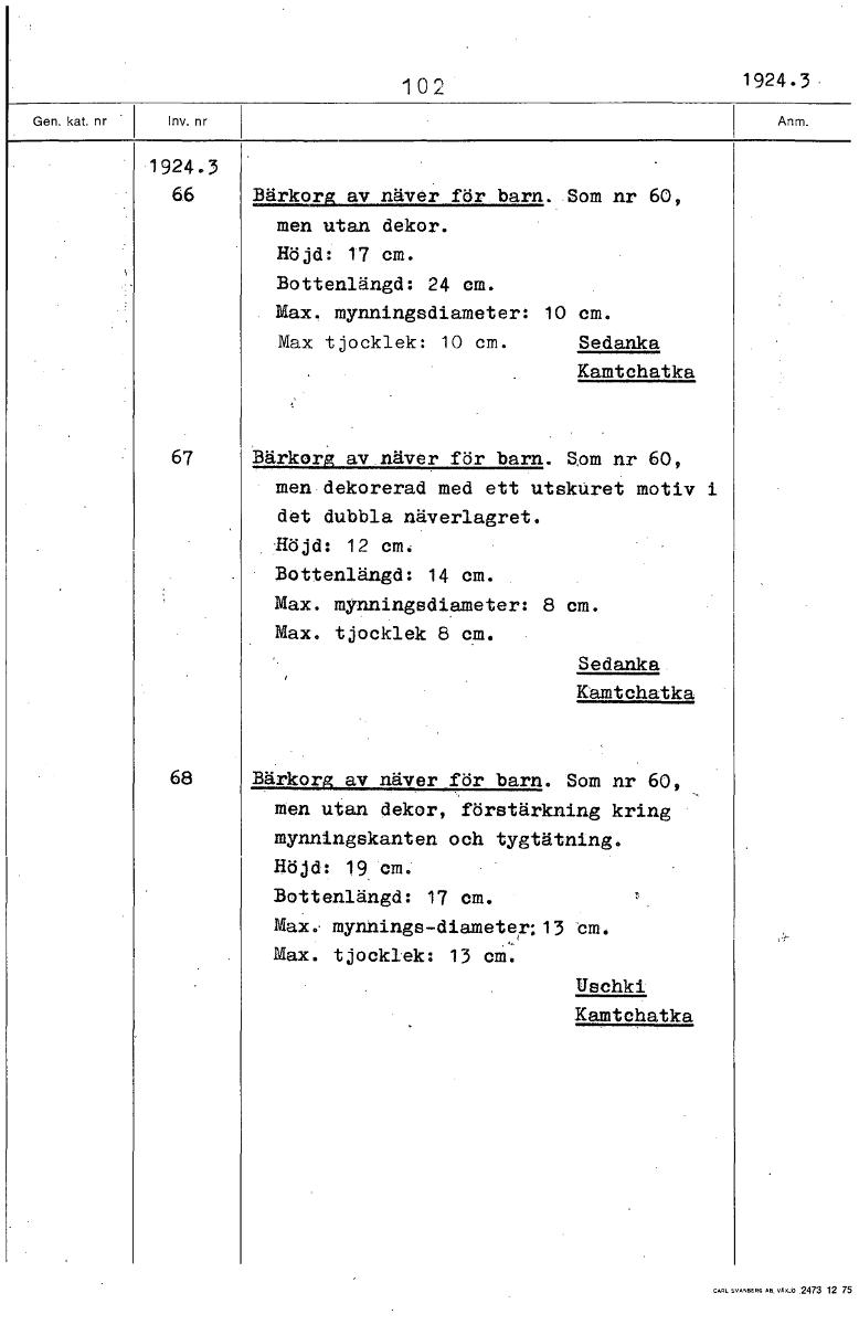 102 1924.3 1924.3 66 Bärkorg av näver för barn. Som nr 60, men utan dekor. Höjd: 17 cm. Bottenlängd: 24 cm. Max. mynningsdiameter: 10 cm. Max tjocklek: 10 cm. Sedanka Kamtchatka 67 Bärkorg av näver fö...Visa hela