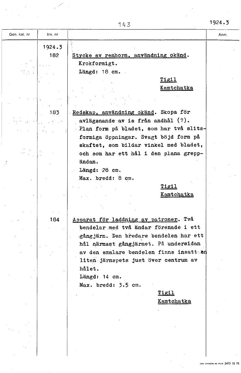 1 43 1924.3 1924.3 182 Stycke av renhorn, användning okänd. Krokformigt. Längd: 18 cm. • Tigil Kamtchatka 183 Redskap. användning okänd. Skopa för avlägsnande av is från andhål (?).. Plan form på blad...Visa hela