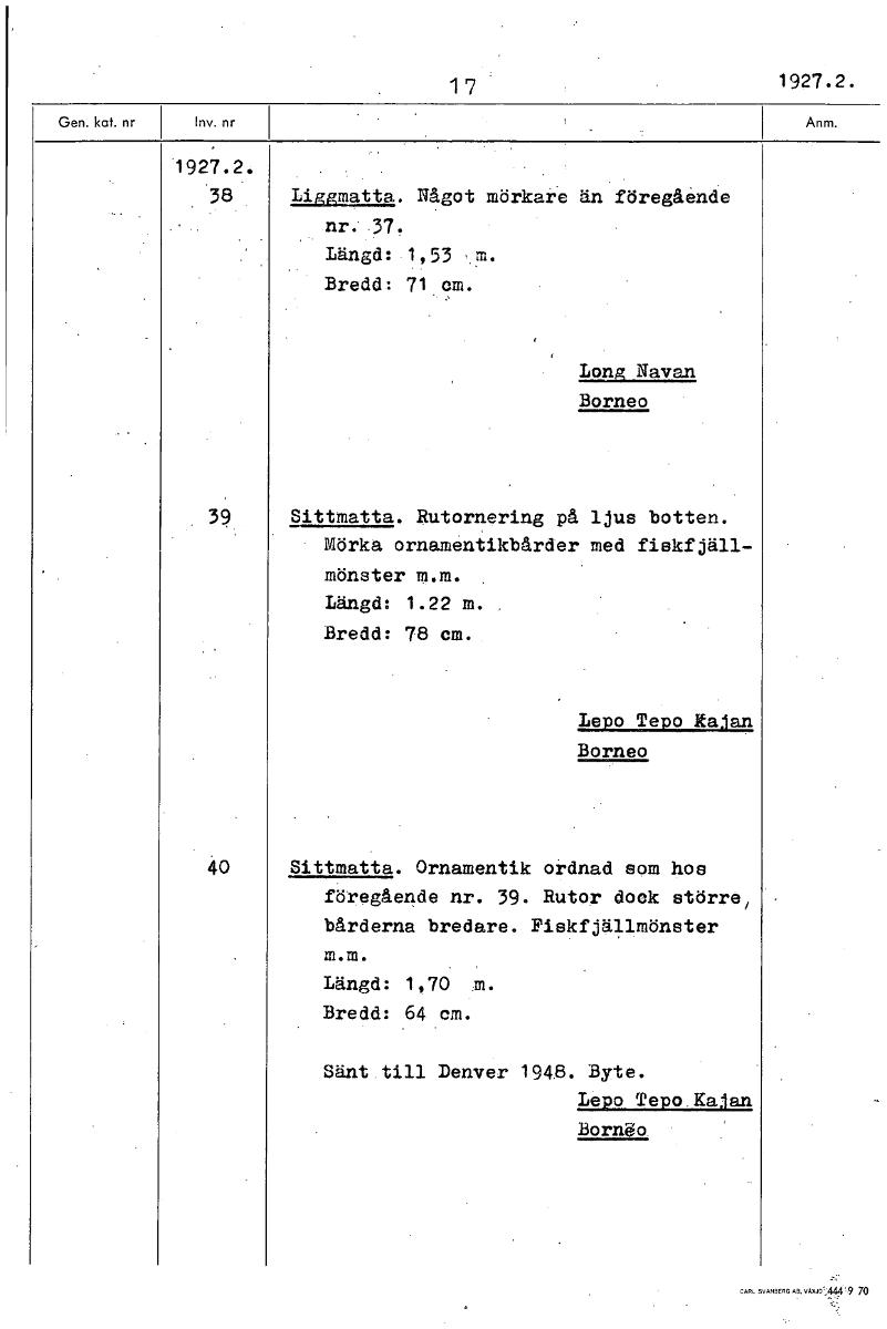 • 17 1927.2. 1927.2. '38 Liggmatta. Något mörkare än föregående nr. 37. Längd: 1,53 m. Bredd: 71 cm. Long Navan Borneo 39 Sittmatta. Rutornering på ljus botten. Mörka ornamentikbårder med fiskfjäll- mön... Visa hela