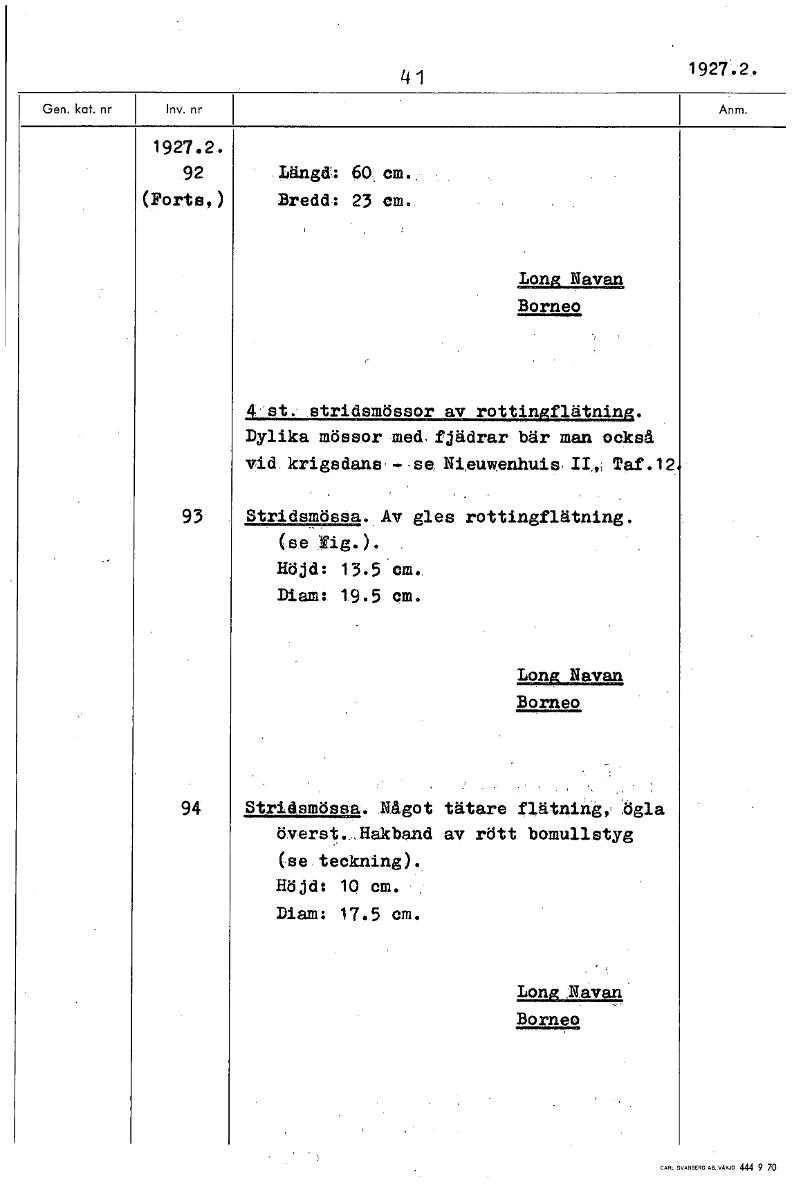1927Å, 4 1 1927.2. 92 _Länga: 60cm..; (Ports') Bredd,: 23 cm.. Long Navan Borneo 4:st.-..stridsmässor av rottingflätning. Dylika mössor -muLfjädrar bär man också v.ick krigsdans, - se. Niguwenhuis, Taf.12 93 Stridsmössa. Av gles rottingflätning. (se Yig.). Höjd: 13.5 cm. Diam: 19.5 cm. Long Navan Borneo 94 Stridsmössa. Något tätare flätning, ögla överst. Hakband av rött bomullstyg (se teckning). Höjd: 10 cm. Diam: 17.5 em. Long Navan Borneo [ocr]