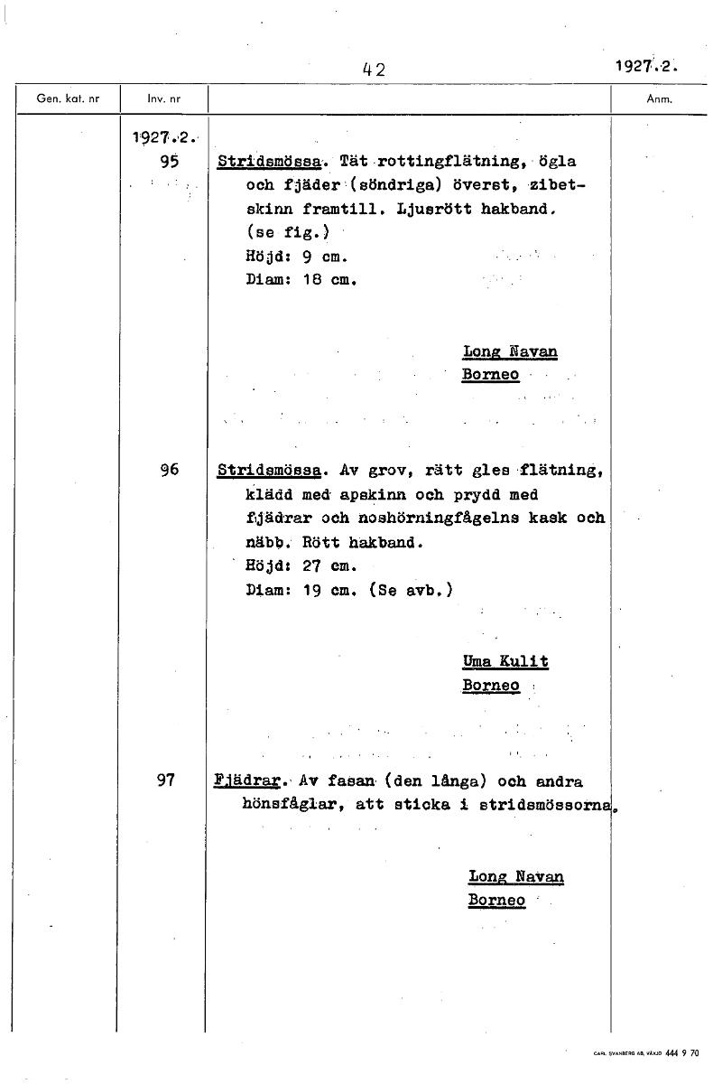 • 42 1927.2. 1927.2. 95 Stridsmössa. Tät rottingflätning, ögla och fjäder (söndriga) överst, zibet- skinn framtill. Ljusrött hakband. (se fig.) Höjd: 9 cm. Diam: 18 cm. Long Navan Borneo 96 Stridsmössa.... Visa hela