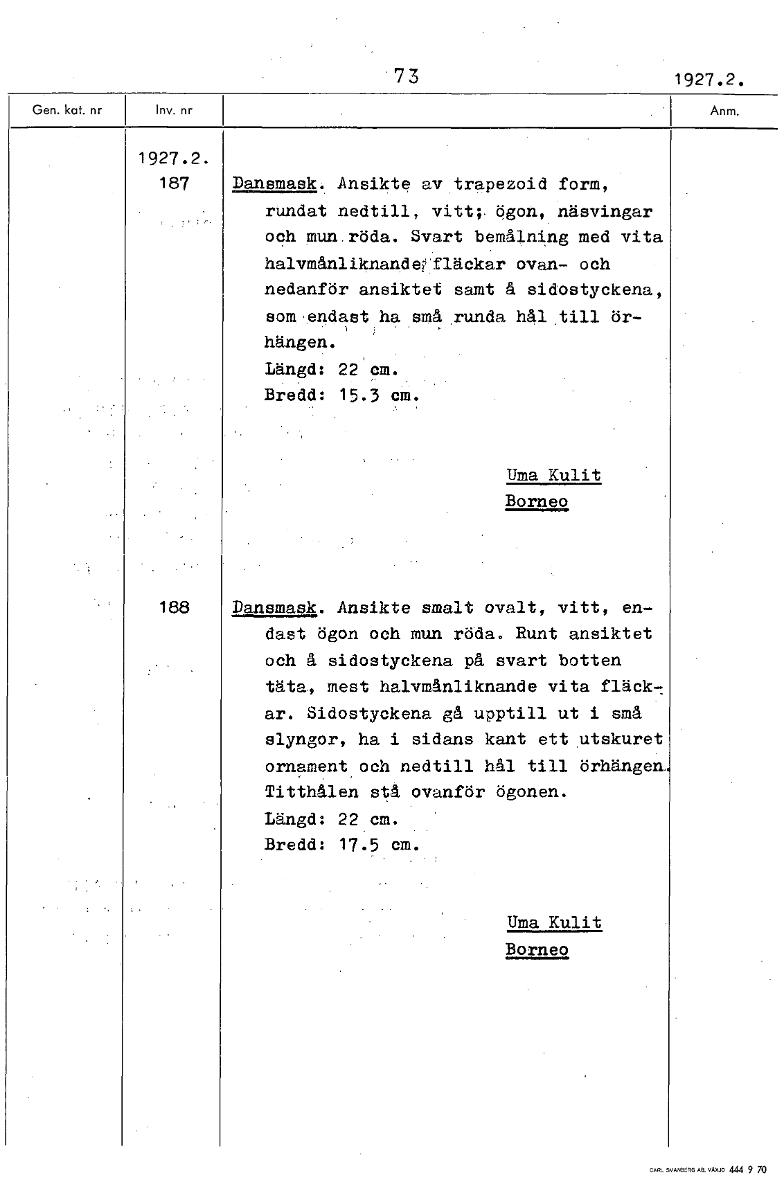 7 3 1927.2. 1927.2. 187 Dansmask. Ansikte av trapezoid form, rundat nedtill, vitt; ögon, näsvingar och mun röda. Svart bemålning med vita halvmånliknanderfläckar ovan- och nedanför ansiktet samt å sidostyckena, som endast ha små, runda hål till ör- hängen. Längd: 22 cm. Bredd: 15.3 cm. Uma Kulit Borneo 188 Dansmask. Ansikte smalt ovalt, vitt, en- dast ögon och mun röda. Runt ansiktet och å sidostyckena på svart botten täta, mest halvmånliknande vita fläck-. ar. Sidostyckena gå upptill ut i små slyngor, ha i sidans kant ett utskuret ornament och nedtill hål till örhängen Titthålen stå ovanför ögonen. Längd: 22 cm. Bredd: 17.5 cm. Uma Kulit Borneo [ocr]