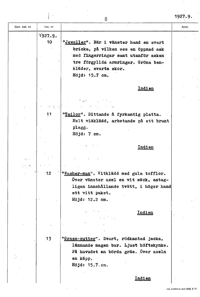 8 1927-9. '1"927.9, 10 "Jemelier". Bär i vänster hand, ensvart bricka, på vilken ses en öppnad ask 'med fingerringar samt utanför asken tre förgylldä armringars. Gröna ben- kläder, svarta skor. Höjd: 15.7 cm. Indien 11 "Tesilor". Sittande å fyrkantig platta. Helt vitklädd, arbetande på ett brunt plagg. Höjd: 7 cm. Indien 12 "Washer-man". Vitklädd med gula tofflor. Över vänster axel en vit säck, antag- ligen innehållande tvätt, i höger hand ett vitt paket. Höjd: 12.2 cm. Indien 13 "Grass-cutter". Svart, rödkantad jacka, lämnande magen bar. Ljust höftskynke. På huvudet en börda gräs. Över axeln en käpp. Höjd: 15.7.cm. Indien [ocr]