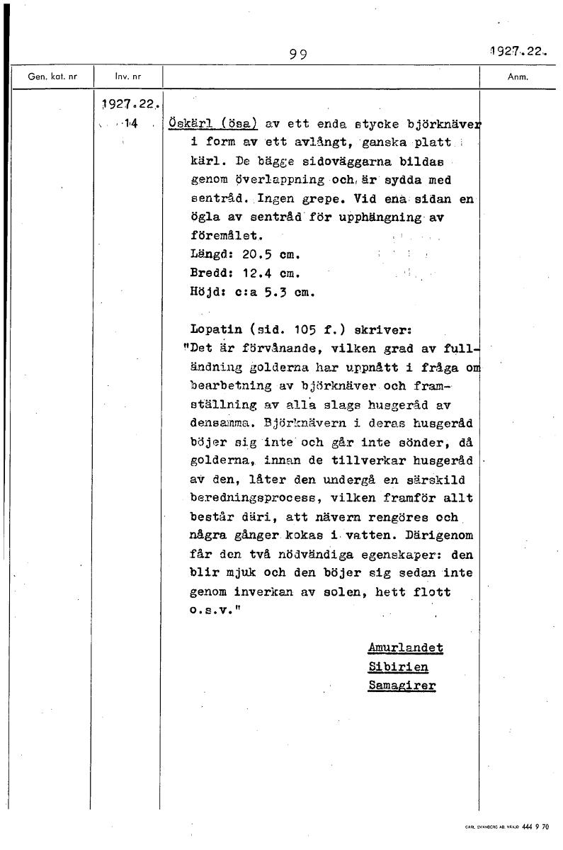 99 1927•22,. 1927.22, ,. -14 , Öskärl (ösa) av ett enda stycke björknäve i form av ett avlångt,:ganska•plattj kärl. De bägge sidoväggarna bildas • genom Overlappning•och,är'sydda med sentråd.,Ingen gr...