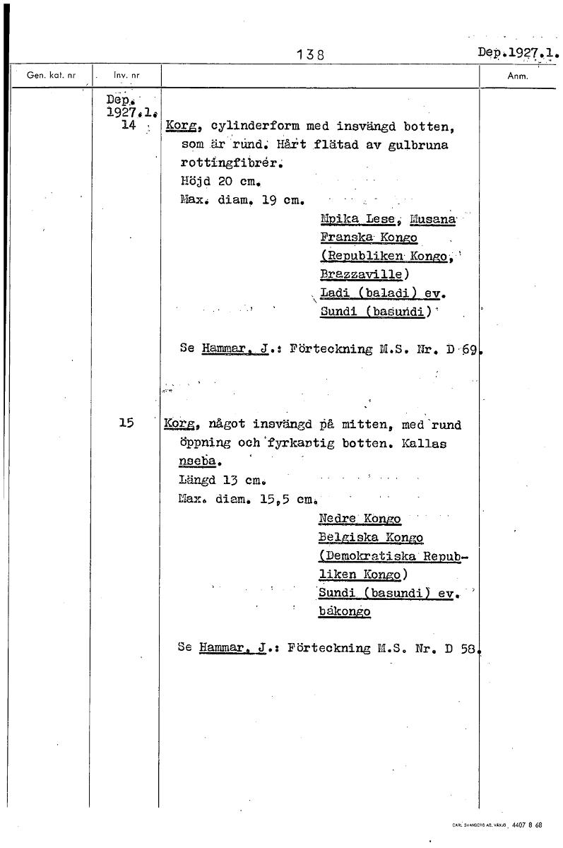 138 Dep.1927.i. DåP4. 19274 4 14 Korg, cylinderform med insvängd botten, som är rånd,; Håt flätad av gulbruna rottingfibrer: Höjd 20 cm. Max. diam. 19 cm. Mpika Lese, Musana Franska Kongo (Republiken Kongo, Brazzaville) Ladi (baladi) ev. Sundi (basundi)` Se Hammar. J.: Förteckning M.S. Nr. D' 9 15 Kong, något insvängd På mitten, med rund öppning och fyrkantig botten. Kallas nseba. Längd 13 cm. Max. diam. 15 5 cm. Nedre Kongo Belgiska Kongo (Demokratiska Repub- liken Kongo) Sundi (basundi) ev. bkikongo Se Hammar. J.: Förteckning M.S. Nr. D 58 [ocr]
