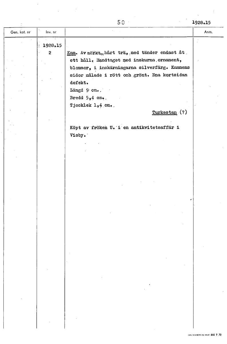 5 0 1928.15 1928„15 2 Kam. Av mötkt, hårt trä , med tänder endast åt ett håll. Handtaget med inskurna, ornament, blommor, i inskärningarna silverfärg. Kammens sidor målade i rött och grönt. Ena kortsi...