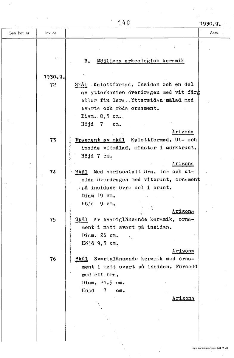 140 1930.,9'.› B. Möjligen arkeologisk keramik 1930.9. 72 Skål ,Kalottformad. Insidan och en del av ytterkanten överdragen med vit fir eller fin lera..Yttersidan-målad. med svarta och röda ornament. Diam.,8'5 cm, Höjd 7 cm. Arizona 73 Fragment av skål Kalottformad.-Ut- och insida vitmålad, mönster f mörkbrunt. Höjd 7 cm. Arizona 74 Skål Med horisontalt öra. In- och ut- sida överdragen med vitbrunt, =amen på insidans övre del i brunt. Diam 19 cm. Höjd 9 cm. Arizona 75 Skål Av svartglänsande keramik, orna- ment i matt svart på insidan. Diam. 26 cm. Höjd 9,5 cm. Arizona. 76 Skål Svnrtglänsande keramik med orna- ment i matt svart på insidan. Försedd med ett öra. Diam. 21,5 cm. Höjd 7 cm. Arizona [ocr]