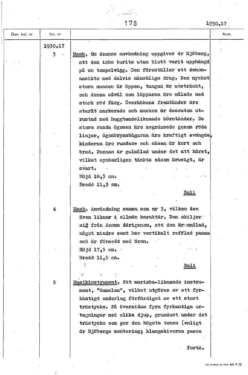 1 7 3 193037 1930.17 3 Mask, Om dennas användning uppgiver dr Mjöberg, ätt den icke burits utan blott varit upphängd på 'en tempelvägg._, Den föreställer ett deåon- ansikte med delvis mänskliga drag. ...