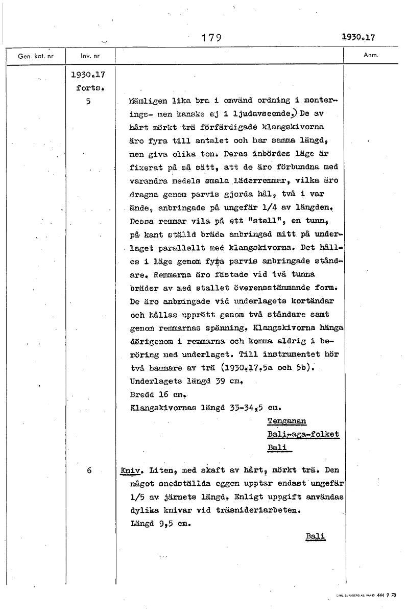 179 193Q.17 1930e17 forts. 5 nämligen lika bra i omvänd ordning i monter- ings- men kanske ej i ljudavseende;)De av hårt mörkt trä förfärdigade klangskivorna äro fyra till antalet och har samma längd,...