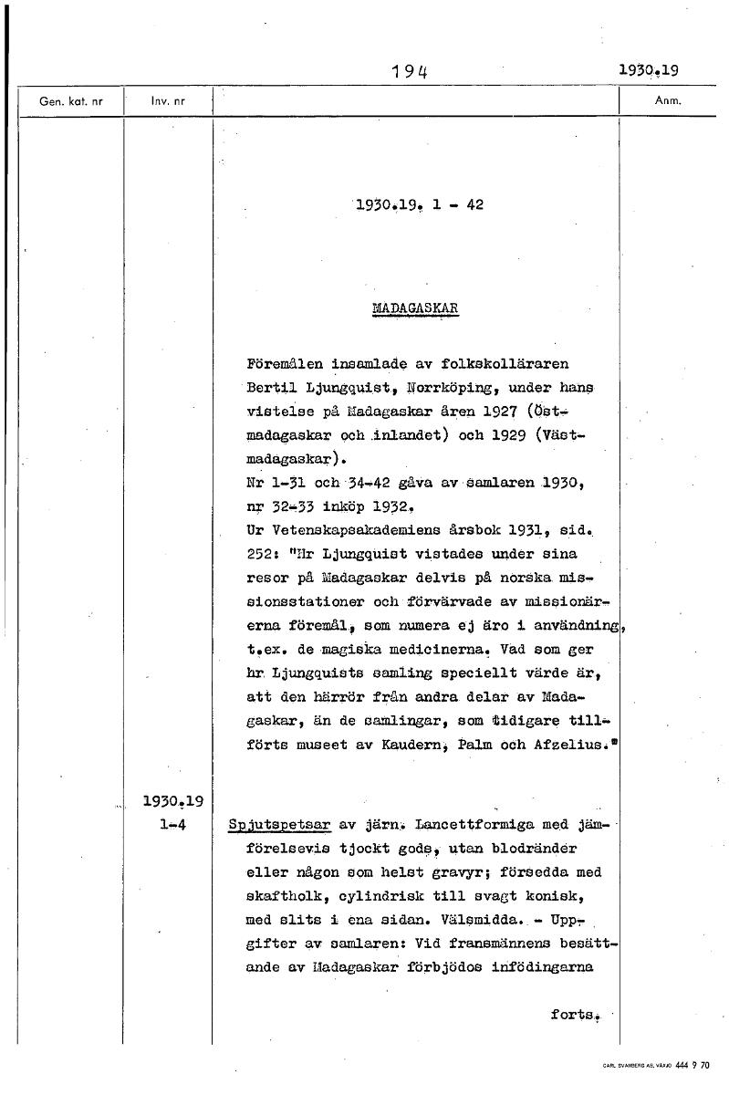 194 193049 1930.19 1 - 42 MADAGASKAR Föremålen insamlade av folkskolläraren Bertil Ljungquist, Norrköping, under hans vistelse på Madagaskar åren 1927 (Öst-madagaskar och inlandet) och 1929 (väst- mad...