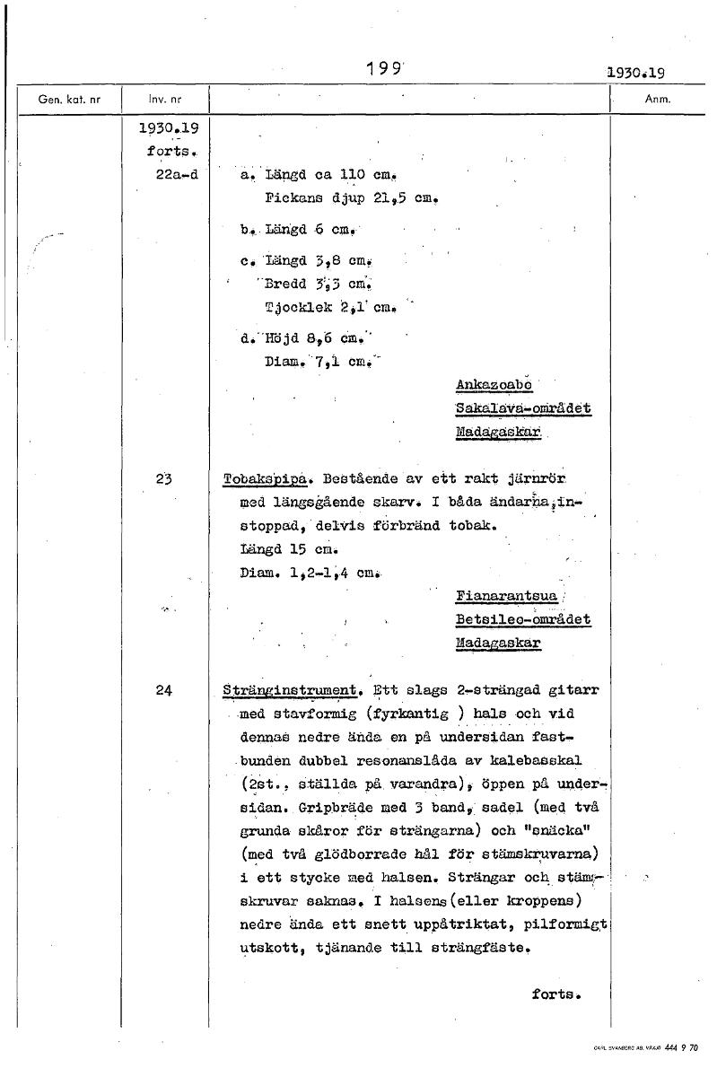1 9 9' 1930.19 1930.19 forts, 22a-d a. Längd ca 110 cm. Fickans djup 21,.5 cm. b4 Längd 6 cm c. Längd 3,8 cm. Bredd 3';3 cra Tjocklek 2,1'cm. d.-Höjd 8,6 cm,'" Diam. 71 om.- Ankazoabö Bakelava-området...