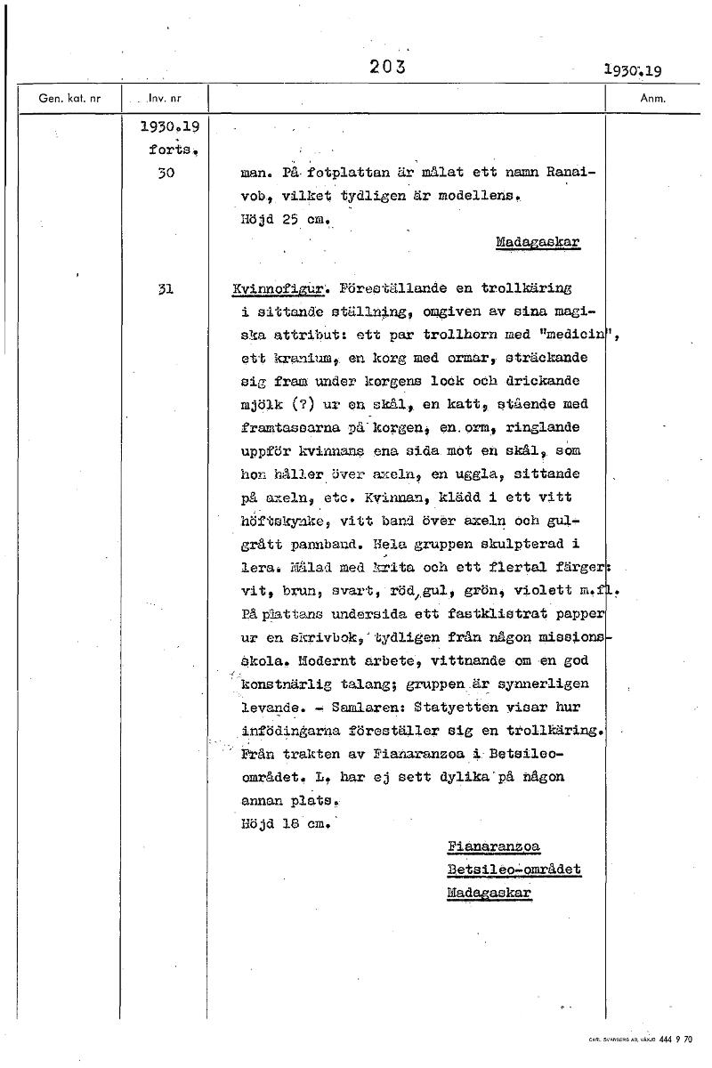 203 193049 1.930.19 f orts. 30 man. På, fotplattan är målat ett namn Ranai- vob, vilket tydligen är modellens. Höjd 25 cm.. Madagaskar 31 Kvinnofigur. Föreställande en trollkäring i sittande ställning...