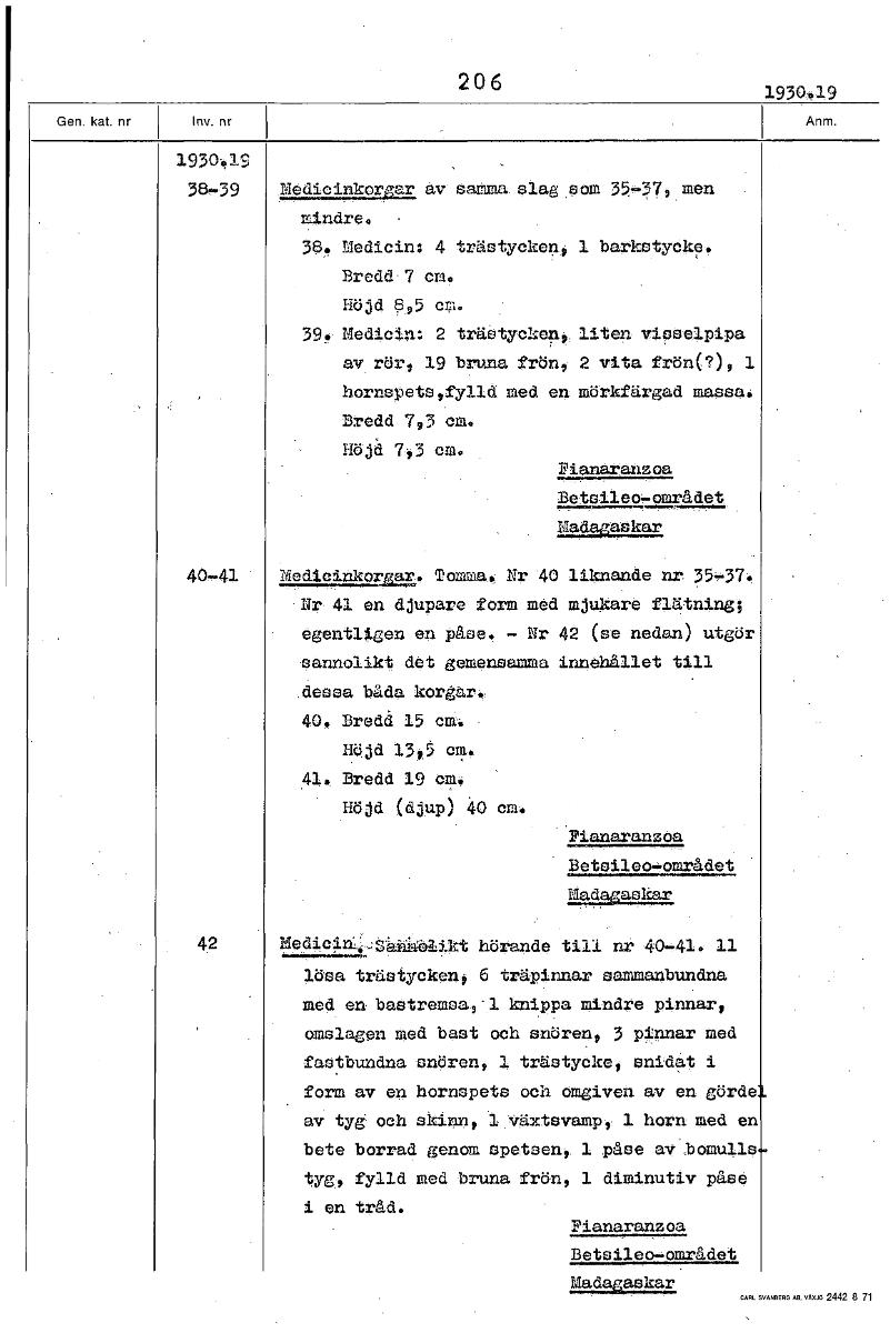 206 1930.19 1930.19 38-39 2912121nggar av sarma slag som 35-37, men mindre. • 38. Medicin: 4 trästycke% 1 barkstycke. Bredd 7 cm. Höjd 8,5 cm. 39. Medicin: 2 träStycken,, liten visselpipa av rör, 19 bruna frön, 2 vita frön(?), 1 hornspets,fylld med en mörkfärgad massa. Bredd 7,3 Om. Höjd 7,3 cm. Pianaranzoa Betsilea-området Madagaskar 40-41 Medicinkorau. Tomma. Nr 40 liknande nr. 35-37. Nr 41 en djupare form med mjukare flätning; egentligen en påse. - Nr 42 (se nedan) utgör sannolikt det gemensamma innehållet till dessa båda korgar. 40. Bredd 15 cm. Höjd 13,5 41. Bredd 19 cm. Höjd (djup) 40 cm. Pianaranzoa Beteilso-området Madagaskar 42 Medic4.121:-oakiktlfict hörande till nr 40-41. 11 lösa trästycke% 6 träpinnar sammanbundna med en bastremsa,-1 knippa mindre pinnar, omslagen med bast och snören, 3 pinnar med fastbundna snören, 1 trästycke, snidat i form av en hornspets och omgiven av en görde av tyg och skinn, 1 växtsvamp, 1 horn med en bete borrad genom spetsen, 1 påse av _bomulls tyg, fylld med bruna frön, 1 diminutiv påse i en tråd. Pianaranzoa Betsileoområdet Madagaskar [ocr]