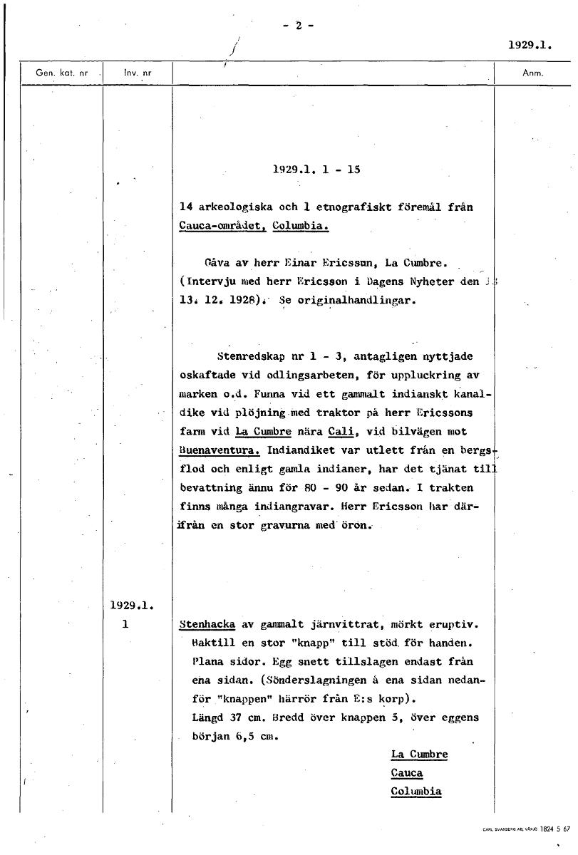 -2- 1929.1. 1929.1. 1 - 15 14 arkeologiska och 1 etnografiskt föremål från Cauca-området, Columbia. Gåva av herr Einar Ericsson, La Cumbre. (Intervju med herr Ericsson i Dagens Nyheter den 13. 12. 192...