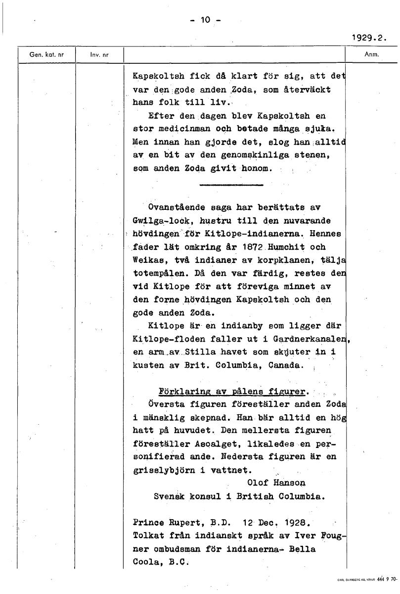 - 10 1929.2. Kapskoltsh fick då klart för sig, att de var den gode anden Zoda, som återväckt hans folk till liv, Efter den dagen blev Kapskoltsh en stor medicinman och betade många sjuka. Men innan han gjorde det, slog han allti av en bit av den genomskinliga stenen, som anden Zoda givit honom. Ovanstående saga har berättats av Gwilga-lock, hustru till den nuvarande hövdingen'för Kitlope-indianerna. Hennes _fader lät omkring år 1872 Humchit och Weikas, två indianer av korpklanen, tälj totempålen. Då den var färdig, restes de vid Kitlope för att föreviga minnet av den forne ,hövdingen Kapskoltsh och den gode anden Zoda. Kitlope är en indianby som ligger där Kitlope-floden faller ut i Gardnerkanale en arm.av.Stilla havet som skjuter in i kusten av Brit. Columbia, Canada. Förklaring av pålens figurer. Översta figuren föreställer anden Zod i mänsklig skepnad. Han bär alltid en hö hatt på huvudet. Den mellersta figuren föreställer Asoalget, likaledes en per- sonifierad ande. Nedersta figuren är en grisslybjörn i vattnet. Olof Hanson Svensk konsul i British Columbia. Prince Rupert, B.D. 12 Dec. 1928. Tolkat från indianskt språk av Iver Foug- ner ombudsman för indianerna- Bella Coola, B.C. [ocr]