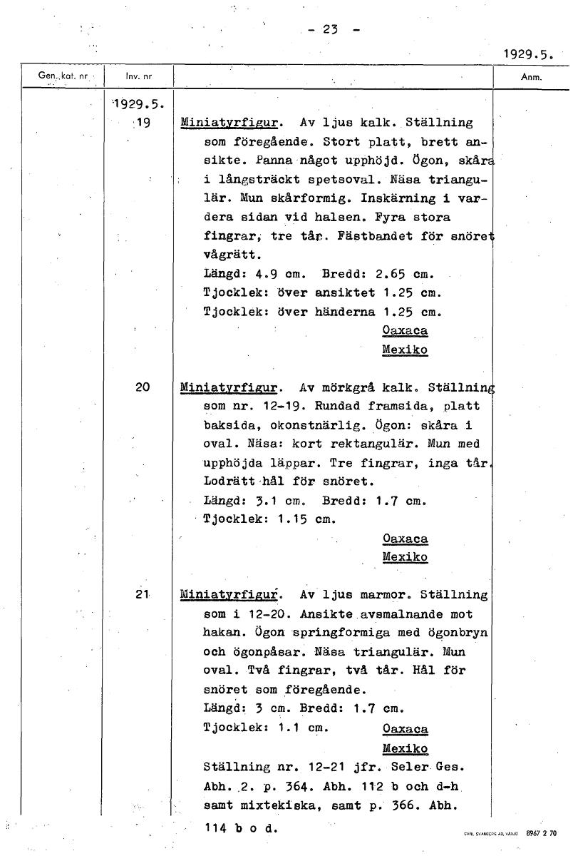 - 23 - 1929.5. 1929.5. i19 Miniatyrfigur. Av ljus kalk. Ställning som föregående. Stort platt, brett an- sikte. Panna något upphöjd. Ögon, skår i långsträckt spetsoval. Näsa triangu- lär. Mun skårform...