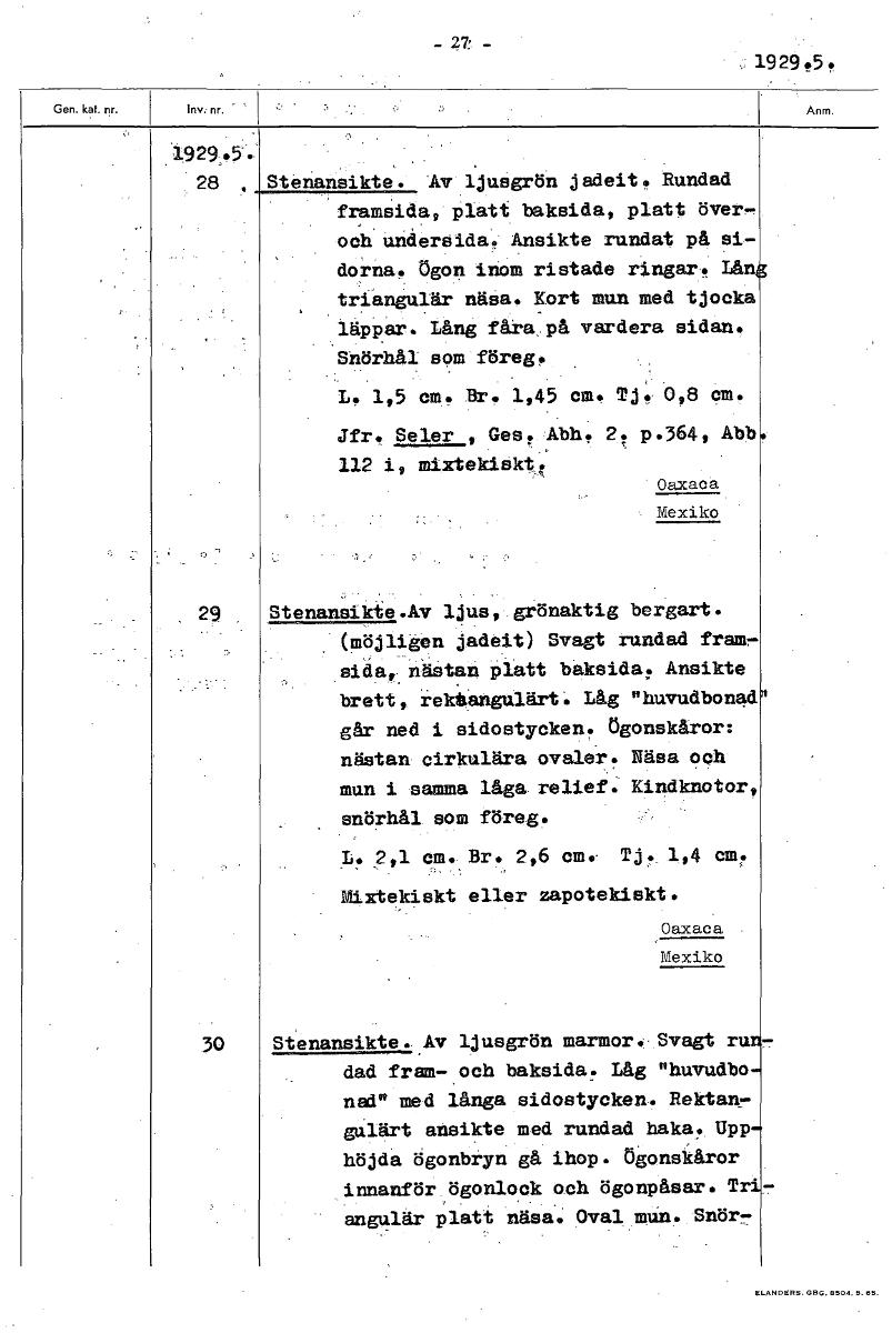 1929.5 1929.5. 28 Stenansikte. Av ljusgrön jadeit. Rundad framsida, platt baksida, platt över- och undersida. Ansikte rundat på si- dorna. ögon inom ristade ringar. Lån triangulär näsa. Kort mun med tjocka läppar. Lång fåra på vardera sidan. Snörhål som föreg. L. 1,5 cm. Br. 1,45 cm. Tj. 0,8 cm. Jfr. Seler Ges. lbh. 2. p.364, Abb 112 i, mixtekiakt. Oaxaca Mexiko 29 Stenansikte.Av ljus,. grönaktig bergart. (möjligen jadeit) Svagt rundad fram- sida, nästan platt baksida. Ansikte brett, rekilangulärt. Låg "huvudbonad går ned i sidostycken. ögonskåror: nästan cirkulära ovaler. Näsa och man i samma låga. relief. Kindknotor, snörhål som föreg. L. 2,1 cm. Br. 2,6 cm.- Tj. 1,4 cm. Mixtekiskt eller zapotekiskt. Oaxaca Mexiko 30 Stenansikte.. Av ljusgrön marmor. Svagt ru dad fram- och baksida. Låg "huvudbo nad" med långa sidostycken. Rektan- gulärt ansikte med rundad haka.. Upp höjda ögonbryn gå ihop. Ögonskåror innanför ögonlock och ögonpåsar. Tr angulär platt näsa. Oval mun. Snör- [ocr]