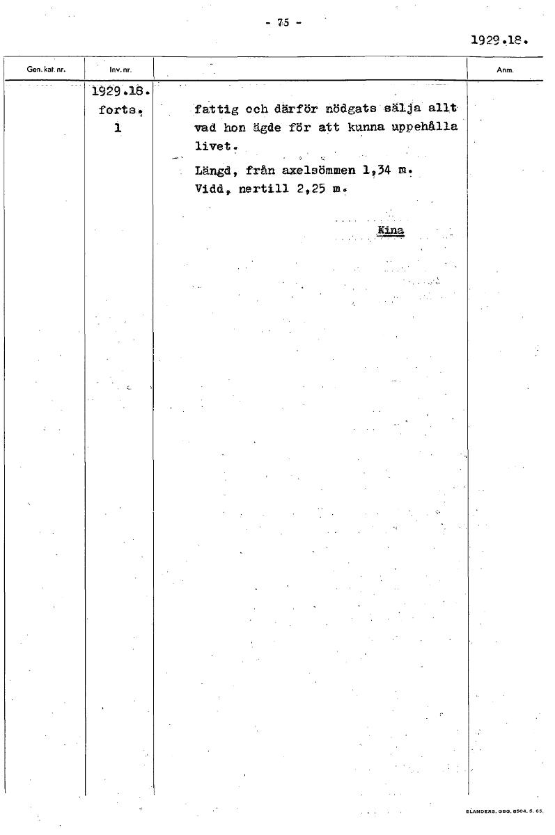 • - 75 - 1929 .18 . 1929.18. forta! fattig och därför nödgats sälja allt 1 vad hon ägde för att kunna uppehålla livet. Längd, från axelsömmen 1934 m. Vidd,. nertill 2,25 m. .Kina [ocr]
