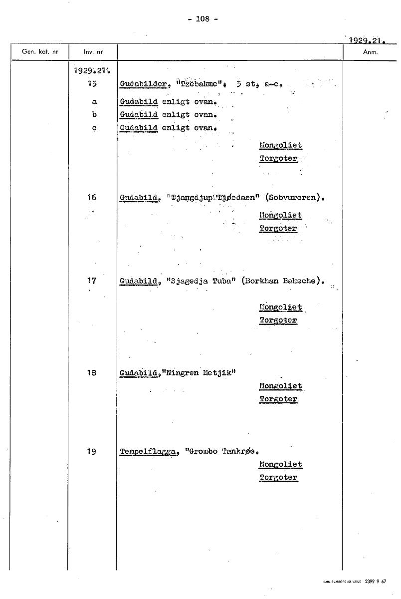 - 108 - 1929,21. 15 Gudabilder, "Tzebakme". 3 st, a—c, a Gudabild enligt ovan: b Gudabild enligt ovan, Gudabild enligt ovan, PAWaiet Torgoter 16 Gudabild, "TjaggdjurCTUOedaen" (Sobvureren). nkopliet orgoter 17 Gudabild9 "Sjagedja Tuba"(Borklan Baksche). Mongoliet Torgoter 18 Gudabild,"Ningren Metjik" Mongoliet Torgoter 19 2521111921, "Grombo Tankr0e, Mongoliet Torgoter [ocr]