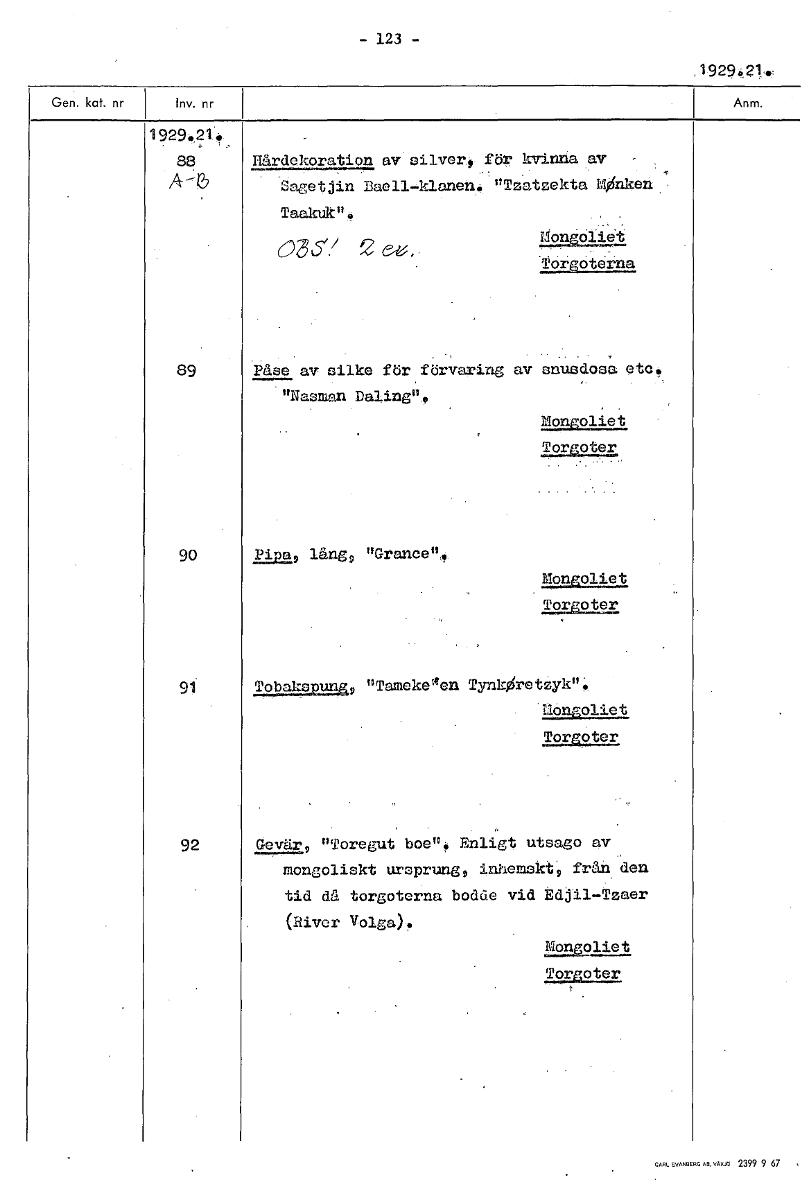 - 123 - 19294,214, Hårdekoration av silver, för kvinna av Sagetjin Daell-klanen, "Tzatzekta MOnken Taakukfte 035" 2e. 1195U99.19 golgoterna 89 Påse av si' ke för förvaring av snusdosa etc, "Nasman Daling", Mongoliet 3192,:f2y192: 90 3.222,9 lång9 "Granee". Mongoliet 2,19T292JPr 91 Tobaksnung9 "Tameke'gen TynkOretzyk", Uongpliet Torgoter 92 Gevår9 "Toregut boen, Enligt utsago av mongoliskt ursprung9 inhemskt9 från den tid då torgotorna bodde vid Edjil-Tzaer (River Volga). Mongoliet yorgoter [ocr]