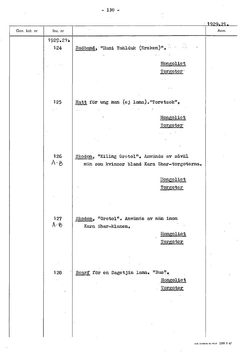 • - 130 - 192q.21 1929.21. 124 Radband, "Mani Taälduk (Braken Mongoliet Toroter. 125 Hatt för ung man (ej lama)."Toretzok". Mongoliet 22ra2t2z• 126 Skodon, "Kiling Grotol". Används av såväl män somkvinn... Visa hela