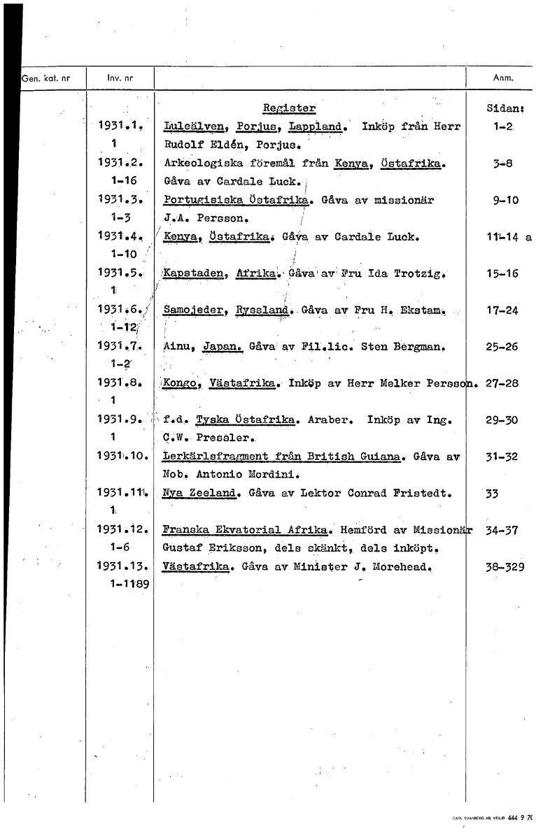 • Register Sidan: 1931.1. Luleälven, Porjus, Lappland. Inköp från Herr 1:=2. 1 Rudolf Eldting Porjus. 1931.2. Arkeologiska föremål från Kenya, Östafrika. 3-8 1-16 Gåva av Cardale Luek., 1931.3. Portugis... Visa hela