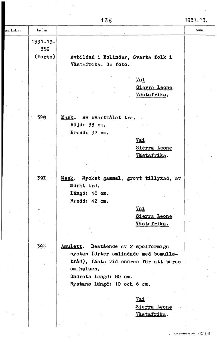 136 1931.13. 1931.13. 389 (Forts) Avbildad i Bolinder, Svarta folk i Västafrika. Se foto. Vai Sierra Leone Västafrika. 399. Mask. Av svartmålat trä. Höjd: 33 cm. Bredd: 32 cm. Vai Sierra Leone Västafrika. 397 Mask. Mycket gammal, grovt tillyxad, av mörkt trä. Längd: 48 cm. Bredd: 42 cm. Vai Sierra Leone Västafrika. 392 Amulett. Bestående av 2 spolformiga nystan (örter omlindade med bomulls- tråd), fästa vid snören för att bäras om halsen. Snörets längd: 80 cm. Nystans längd: 10 och 6 cm. Val Sierra Leone Västafrika. [ocr]Stäng