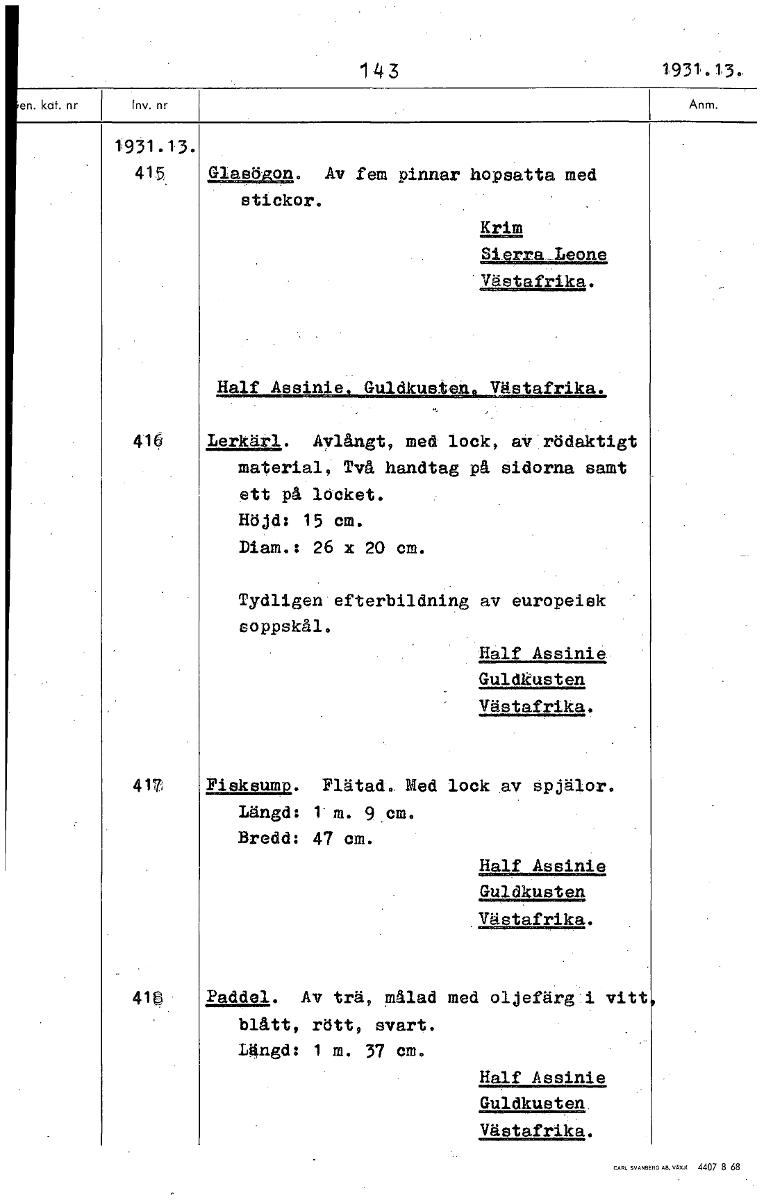 143 1931 .13. 1931.13. 415 Glasögon. Av fem pinnar hopsatta med stickor. Krim Sierra_Leone Västafrika. Half Assinie Guldkusten Västafrika. 416 Lerkärl. Avlångt, med lock, av rödaktigt material, Två handtag på sidorna samt ett på locket. Höjd: 15 cm. Diam.: 26 x 20 cm. Tydligen efterbildning av europeisk soppskål, Half Assinie Guldkusten Västafrika. 417 Fisksump. Flätad. Med lock av spjälor. Längd: 1 m. 9 cm. Bredd: 47 cm. Half Assinie Guldkusten Västafrika. 41g • Paddel. Av trä, målad med oljefärg i vitt blått, rött, svart. Längd: 1 m. 37 cm. Half Assinie Guldkusten Västafrika. [ocr]