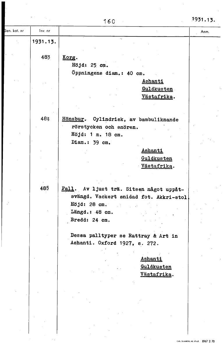 l 160 1931.13. 1931.1 483 Korg. Höjd: 25, cm. Öppningens diam.: 40 cm. Ashanti Guldkusten Västafrika. 484. Hönsbur. Cylindrisk, av bambuliknande rörstycken och snören. Höjd: 1 m. 18 cm. Diam.: 39 cm. Ashanti Guldkusten Västafrika. 485 Pall. Av ljust trä. Sitsen något uppåt- svängd. Vackert snidad fot. Akkri-stol Höjd: 28 cm. Längd.: 48 cm. Bredd: 24 cm. Dessa palltyper se Rattray & Art in Ashanti. Oxford 1927, s. 272. Ashanti Guldkusten Västafrika. [ocr]Stäng