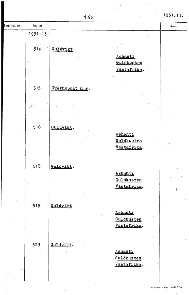 • l 168 1931.13. 1931.13. 514, Guldvikt. Ashanti Guldkusten Västafrika. 515, Överhoppat n:r. 516 Guldvikt. Ashanti Guldkusten Västafrika. 511 Guldvikt. Ashanti Guldkusten Västafrika. 518 Guldvikt. Ashan... Visa hela