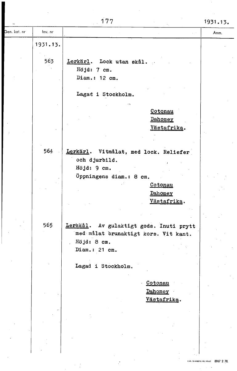 • t 177 1931.13. 1931.13. 563 Lerkärl. Lock utan ekål. Höjd: 7 cm. Diam.: 12 cm. Lagat i Stockholm. Cotonau Dahomey Västafrika. 564 Lerkärl. Vitmålat, med lock. Reliefer och djurbild. Höjd: 9 cm. öppnin... Visa hela