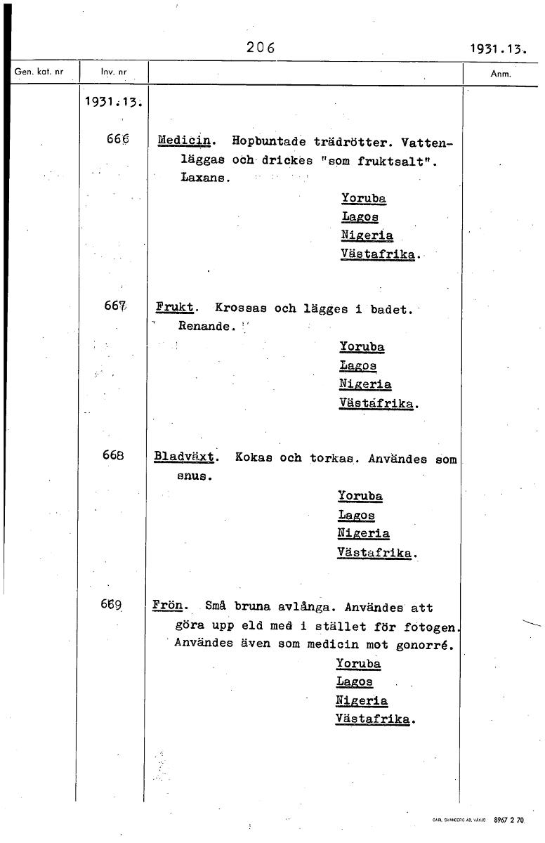 206 1931.13, 1931 1 3 660 Medicin. Hopbuntade trädrötter. Vatten- läggas och drickes "som fruktsalt". Laxans. Yoruba Lagos Nigeria Västafrika. 667 Frukt. Krossas och lägges i badet. Renande. Y Yoruba Lagos Nigeria Västkifrika. 668 Bladväxt. Kokas och torkas. Användes som snus. Yoruba Lagos Nigeria Västafrika. 669 Frön. Små bruna avlånga. Användes att göra upp eld med i stället för fotogen Användes även som medicin mot gonorré. Yoruba Lagos Nigeria Västafrika. [ocr]Stäng