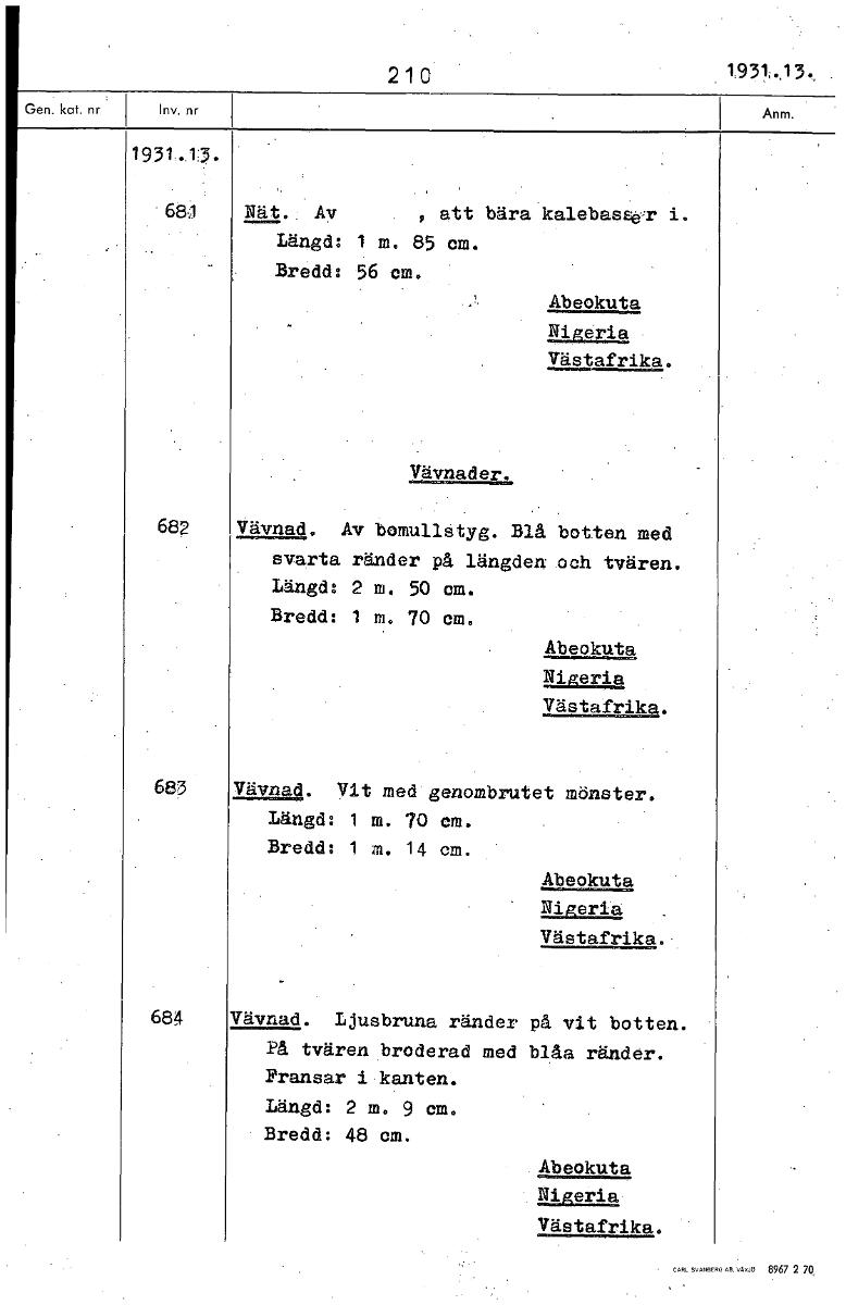 210 1,93y.,13„ 681 Nät.: Av n att bära kalebaskr i. Längd: 1 m. 85 cm. Bredd: 56 em. Abeokuta Nigeria Västafrika. Vävnader. 68p Vävnad. Av bomullstyg. Blå botten med svarta ränder på längden och tvären. Längd: 2 m. 50 cm. Bredd: 1 m. 70 cm. Abeokuta Nigeria Västafrika. 683 Vävnad. Vit med genombrutet mönster. Längd: 1 m. 70 cm. Bredd: 1 m. 14 cm. Abeokuta Nigeria Västafrika. 684 Vävnad. Ljusbruna ränder på vit botten. På tvären broderad med blåa ränder. Fransar i kanten. Längd: 2 m. 9 cm. Bredd: 48 cm. Abeokuta Nigeria: Västafrika. [ocr]Stäng