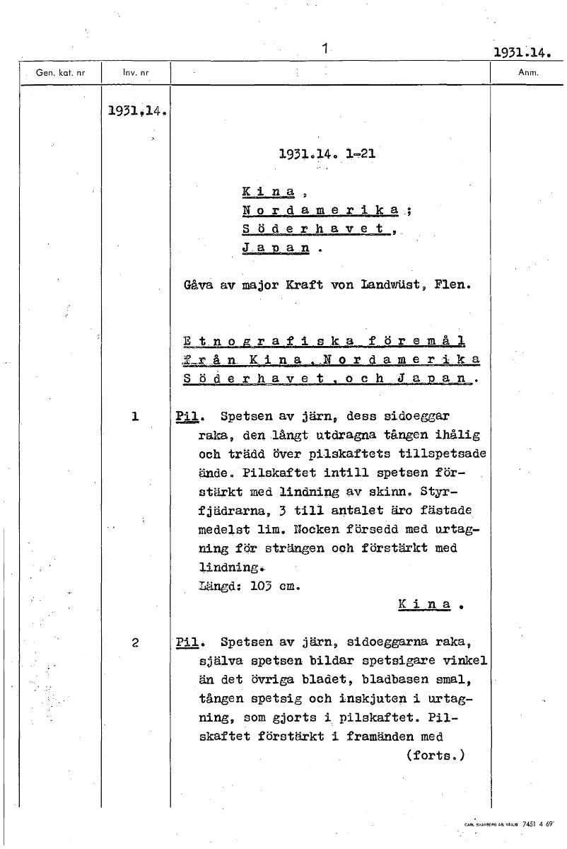 1931.14. 1931,14. 1931.14. 1-21 Nordamerika; Söderhavet, Gåva av major Kraft von liandwast, Flen. Etnografiska föremål f_r_ån Kina _Nordamerika Söderhavet .och Japan. 1 Spetsen av järn, dess sidoeggar...