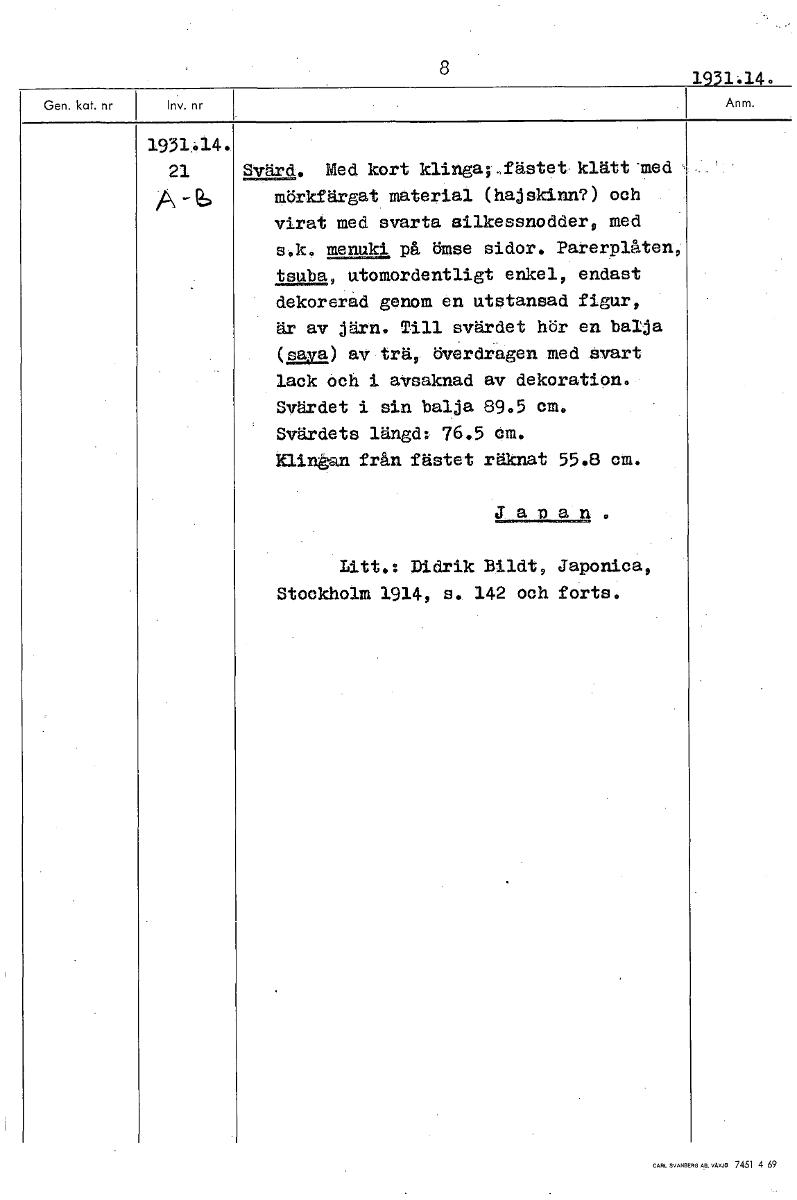 8 1931.14. Svärd. Med kort klinga; fästet klätt-med mörkfärgat material (hajskinn?) och virat med svarta eilkessnodder, med s.k. menuki på ömse sidor. Parerplåten, tsuba, utomordentligt enkel, endast dekorerad genom en utstansad figur, är av järn. Till svärdet hör en balja (salva) av trä, överdragen med svart lack och i avsaknad av dekoration. Svärdet i sin balja 89.5 cm. Svärdets längd: 76.5 om. flinan från fästet räknat 55.8 cm. JaDan. Litt.: Didrik Bildt, Japonica, Stockholm 1914, s. 142 och forts. [ocr]