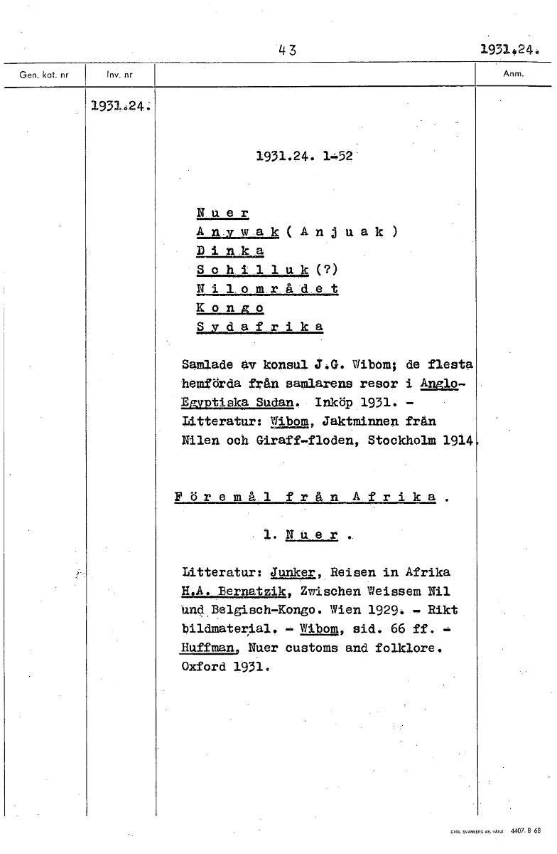 4 3 19314,24. 1931.24.; 1931.24. 1-52 N uer Anywak(Anjuak) D inka Schilluk(?) N i 10mrå,det K ongo S ydafrika Samlade av konsul J.G. Wibom; de flesta hemförda från samlarens resor i Anglo- Egyptiska Sudan. Inköp 1931. - Litteratur: Wibom, Jaktminnen från Nilen och Giraff-floden, Stockholm 1914 Föremål från Afrika 1. Nuer Litteratur: Junker, Reisen in Afrika H.A. Bernatzik, Zwischen Weissem Nil und. Belgisch-Kongo. Wien 1929: - Rikt bildmaterial. - Wibom, sid. 66 ff. Huffman, Nuer customs and folklore. Oxford 1931. [ocr]