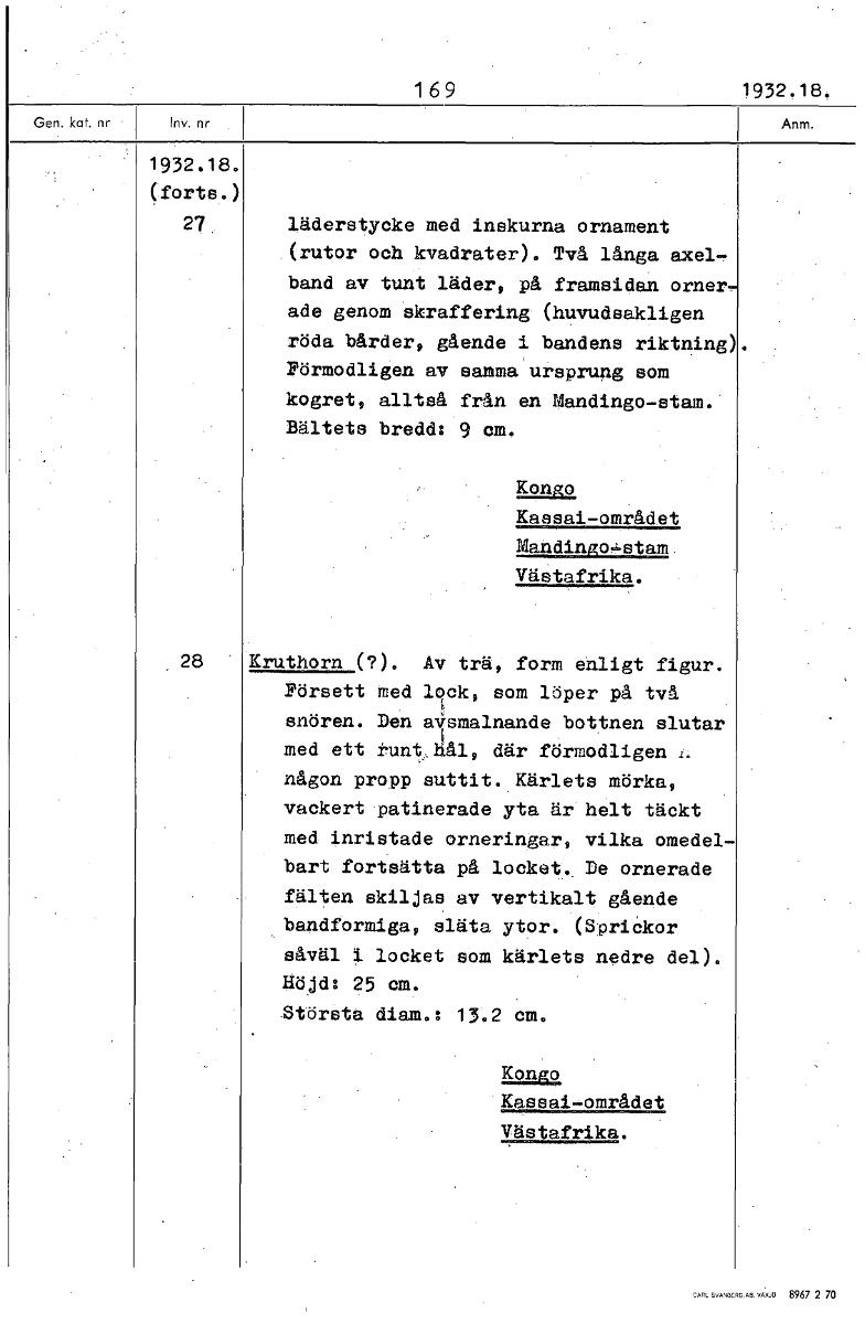 1 6 9 1932.18. 1932.18. (forte.) 27. läderstycke med inskurna ornament .(rutor och kvadrater). Två långa axel-, band av tunt läder, på framsidan orner_ ade genom skraffering. (huvudsakligen röda bårder, gående i bandens riktning) Förmodligen av samma ursprung som kogret, alltså från en Mandingo-stam. Bältets bredd: 9 em. Emu. Kassai-området Mandingo.stam Västafrika. 28 Kruthorn Mo Av trä, form enligt figur. Försett med lock, som löper på två snören. Den avsmalnande bottnen slutar med ett tunt hål, där förmodligen någon propp suttit. Kärlets mörka, vackert patinerade yta är helt täckt med inristade orneringar, vilka omedel- bart fortsätta på locket. De ornerade fälten skiljas av vertikalt gående bandformiga, släta ytor. (Sprickor såväl i locket som kärlets nedre del). Höjd: 25 cm. Största diam.: 13.2 cm. Kongo Kassas-området Västafrika. [ocr]
