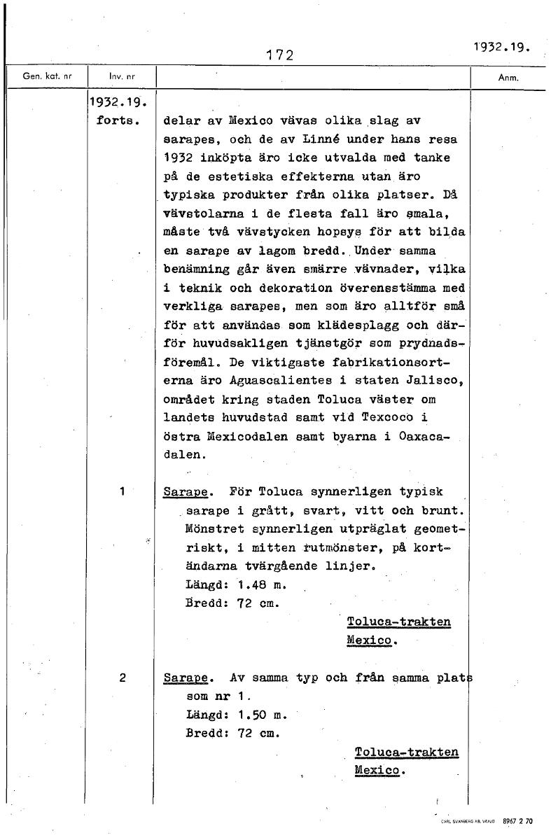 1932.19. 172 1932.19. forts. delar av Mexico vävas olika slag av sarapes, och de av Linnio under hans resa 1932 inköpta äro icke utvalda med tanke på de estetiska effekterna utan äro typiska produkter...