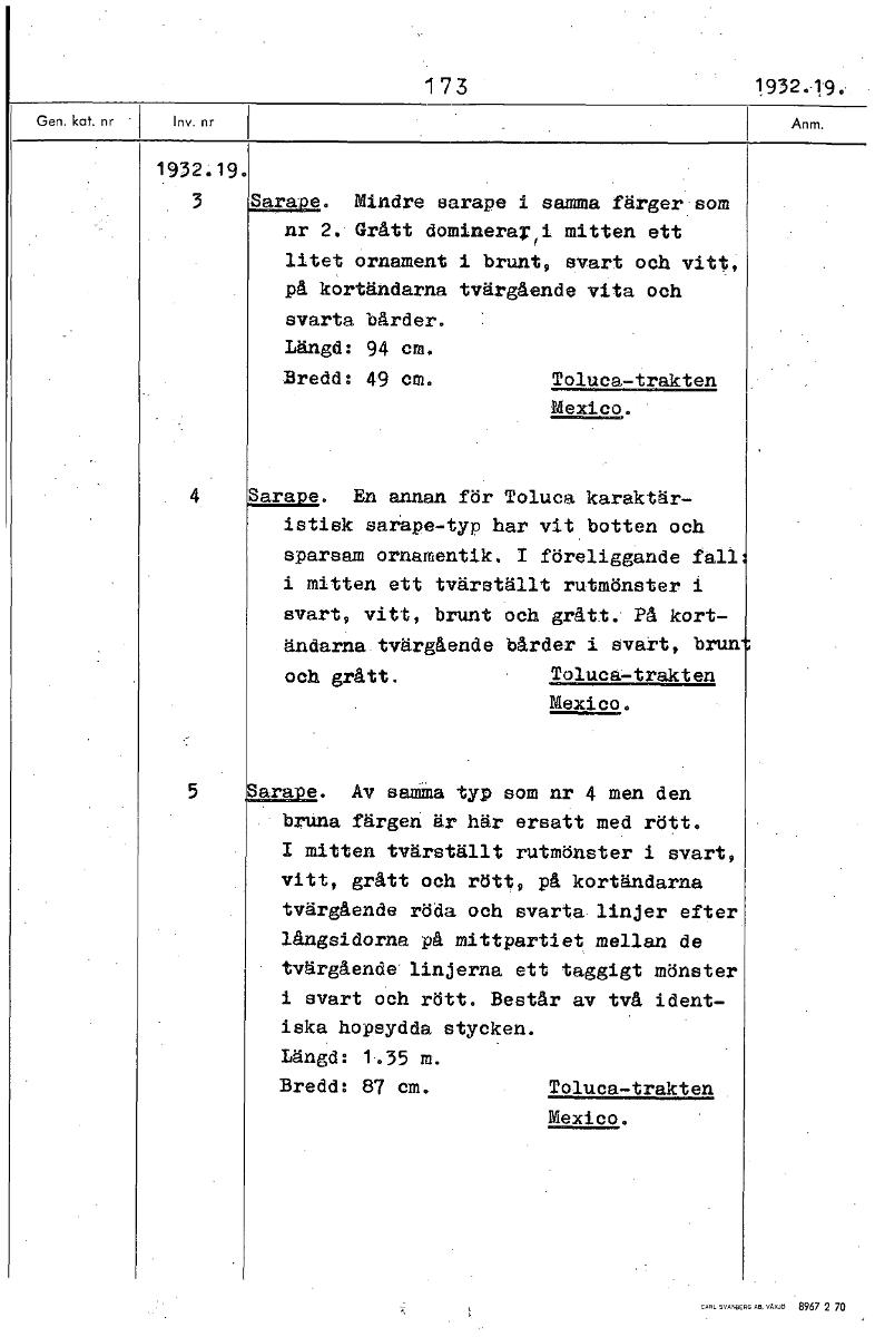 1 7 3 1932.-19. 1932.19. 3 Same. Mindre sarape i samma färger som nr 2. Grått dominerarti mitten ett litet ornament i brunt, svart och vitt, på kortändarna tvärgående vita och svarta bårder. Längd: 94 cm. Bredd: 49 cm. Toluca-trakten Mexico. Sara e. En annan för Toluca karaktär- istisk sarape-typ har vit botten och sparsam ornamentik. I föreliggande fall i mitten ett tvärställt rutmönster i svart, vitt, brunt och grått. På kort- ändarna tvärgående bårder i svart, brun och grått. Toluca-trakten Mexico. Sara e. Av samma typ som nr 4 men den bruna färgen är här ersatt med rött. I mitten tvärställt rutmönster i svart, vitt, grått och rött, på kortändarna tvärgående röda och svarta linjer efter långsidorna på mittpartiet mellan de tvärgående linjerna ett taggigt mönster i svart och rött. Består av två ident- iska hopsydda stycken. Längd: 1.35 m. Bredd: 87 cm. Toluca-trakten Mexico. [ocr]