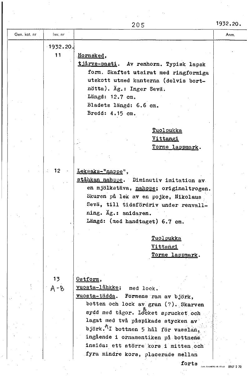 205 1932.20. 1932.20. 11 Hornsked, tjårve-pasti. Av renhorn. Typisk lapsk form. Skaftet utsirat med ringformiga utskott utmed kanterna (delvis bort- nötta). Äg.: Inger Sevä. Längd: 12.7 cm. Bladets längd: 6.6 cm. Bredd: 4.15 cm. Tuoloukka Vittangi Torne lappmark. 12 Leksaks-"nappen, stånkan nahpoe. Diminutiv imitation av en mjölkstäva, nahope; originaltrogen. Skuren på lek av en pojke, Nikolaus Sevä, till tidsfördriv under renvall- ning. Äg.: snidaren. Längd: (med handtaget) 6.7 om. Tuolpukka Vittangi Torne lappmark. 13 Ostform, vuosta-låhkke; med lock. vuosta-tädda. Formens ram av björk, botten och lock av. gran (?). Skarven h sydd med tågor. Locket sprucket, och lagat med två påspikade stycken av björkYk bottnen 5 hål för vasslan, ingående i ornamentiken på bottnene insida: ett större kors i mitten och fyra mindre kors, placerade mellan forts [ocr]