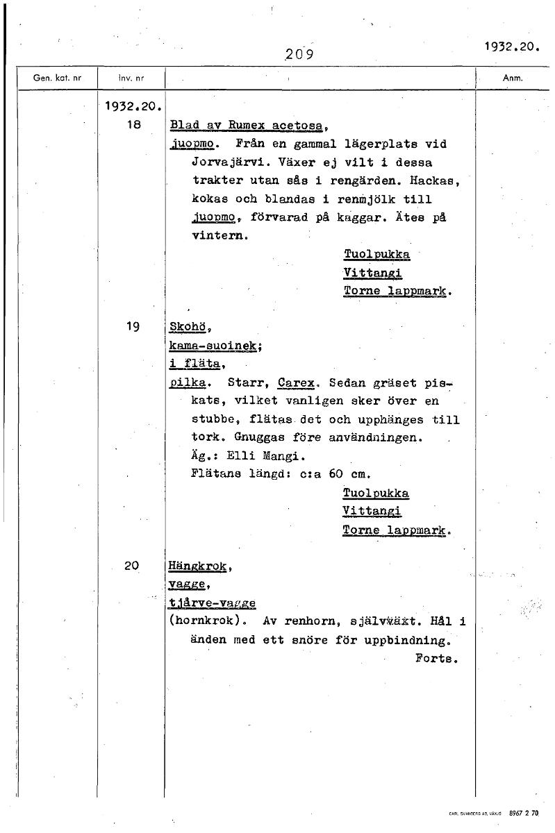 • 209 1932.20. 1932,20. 18 Blad av Rumex acetosa, juopmo. Från en gammal lägerplats vid Jorvajärvi. Växer ej vilt i dessa trakter utan sås i rengärden. Hackas, kokas och blandas i renmjölk till jUODMO, ... Visa hela