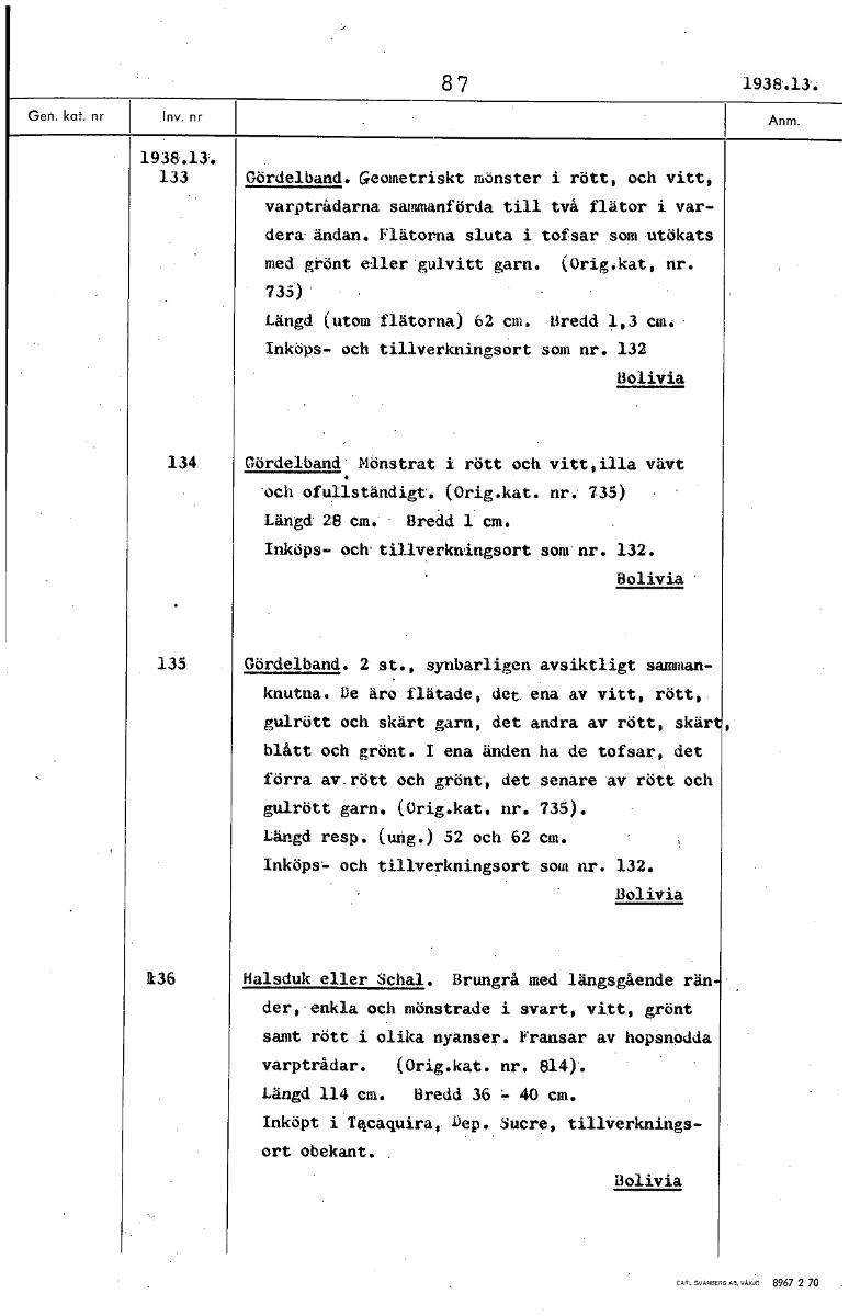• 8 7 1938.13'. 133 Gördelband. Geometriskt monster i rött, och vitt, varptrådarna sammanförda till två flätor i var- dera ändan. Flätorna sluta i tofsar som utökats med grönt eller gulvitt garn. (Orig.... Visa hela