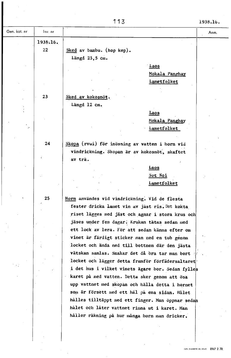 113 1938.16. 1938:16, 22 Sked av bambu. (hop kep). Längd 25,5 cm. 'Laos Mokala Panghay Lametfolket 23 Sked av kokosnöt. Längd 12 cm. Laos Mokala Panghay Lametfolket 24 Skopa (rvui) för inösning av vatten i horn vid vindrickning. Skopan är av kokosnöt, skaftet av trä. Laos Sot Noi Lametfolket 25 Horn användes vid vindrickning Vid de flesta fester dricka lamet vin av jäst ris.ret kokta riset lägges med jäst och agnar i stora krus och jäses under fem dagar. Krukan tätas sedan med ett lock av lera. För att sedan känna efter om vinet är färdigt sticker man ned en tub genom locket och ända ned till bottnen där den jästa vätskan samlas. Smakar det då bra tar man bort locket och lägger detta framför förfädersaltaret» i det hus i vilket vinets ägare bor. Sedan fylle karet på med vatten. Detta sker genom att ösa upp vattnet med skopan och hälla detta i hornet som är försett med ett hål på ena sidan. Hålet hålles tilltäppt med ett finger. Man öppnar sela hålet och låter vattnet rinna ut i karet. Man håller räkning på hur mänga horn man dricker. [ocr]Stäng