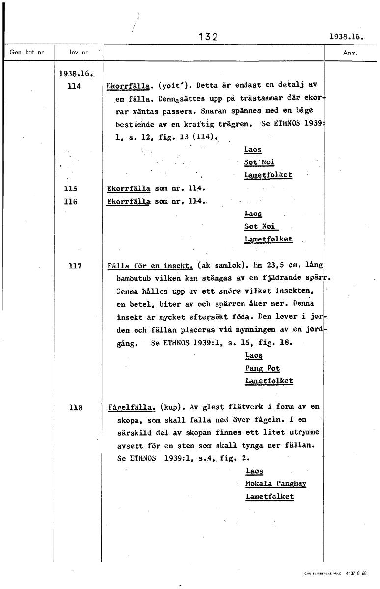132 1938.16. 1938.16.L 114 Ekorrfälla. (yoiti). Detta är endast en detalj av enfälla. Dennasättes upp på trästammar där ekor rar väntas passera. Snaran spännes med en båge bestående av en kraftig trägren. :Se ETHNOS 1939: 1, s. 12, fig. 13 (114). Laos Sot'Noi Lametfolket 115 Ekorrfälla som nr. 114. 116 Ekorrfälla som nr. 114., Laos Sot Noi Lametfolket 117 Fälla för en insekt. (ok samlok). fin 23,5 cm. lång bambutub vilken kan stängas av en fjädrande spärr. Denna hålles upp av ett snöre vilket insekten, en betel, biter av och spärren åker ner. Denna insekt är mycket eftersökt föda. Den lever i jor den och fällan placeras vid mynningen av en jord- gång. Se ETHNOS 1939:1, s. 15, fig. 18. Laos Pang Pot Lametfolket 118 Fågelfälla. (kup). Av glest flätverk i form av en skopa, som skall falla ned över fågeln. 1 en särskild del av skopan finnes ett litet utrymme avsett för en sten sam skall tynga ner fällan. Se ETHNOS 1939:1, s.4, fig... 2. Laos Mokala Panghay Lametfolket [ocr]