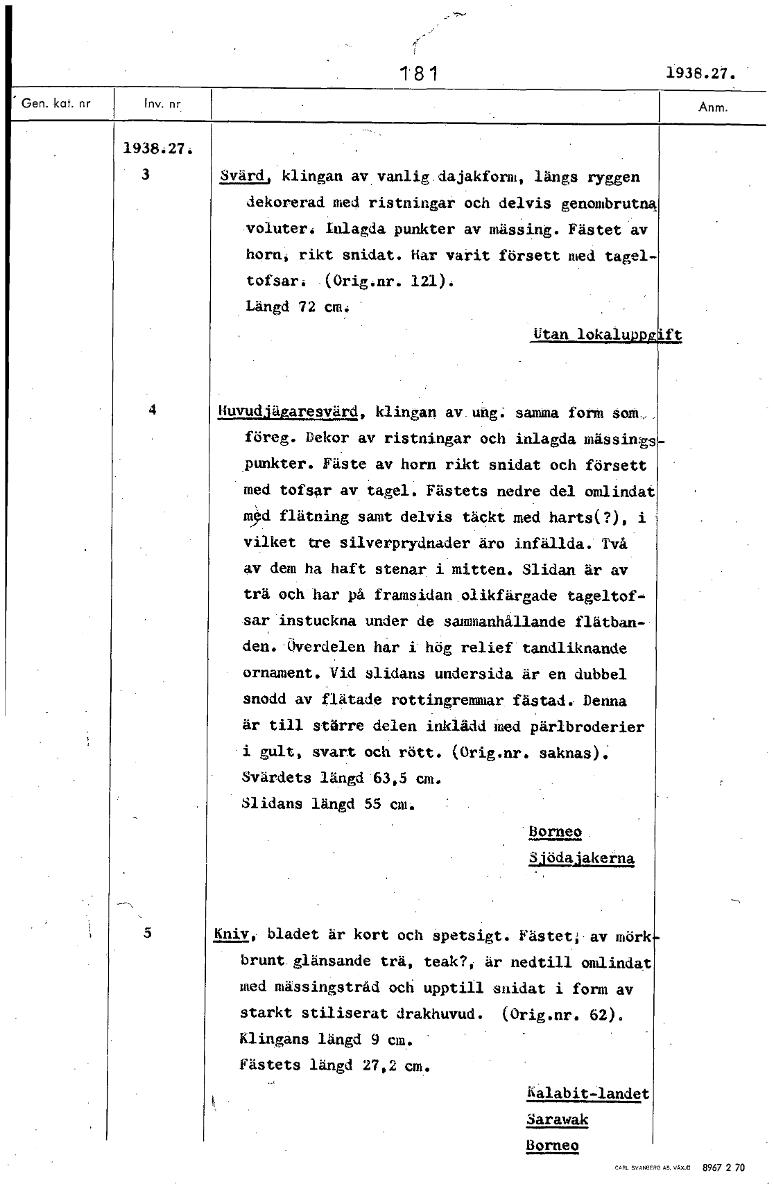 181 1938.27. Anm. 1938:27: 3 Svärd, klingan av vanlig dajakform, längs ryggen dekorerad med ristningar och delvis genombrutna voluter. inlagda punkter av mässing. Fästet av horn, rikt snidat. Har vari...