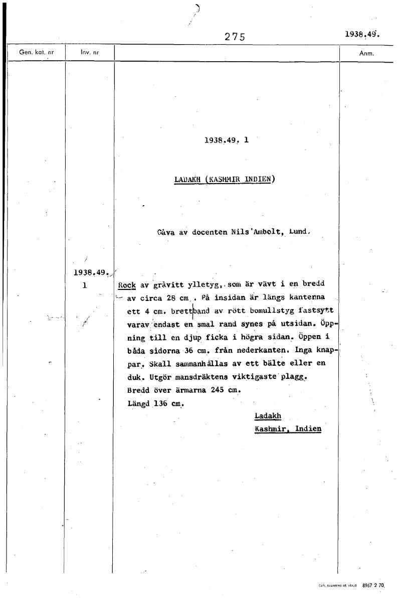 275 1938.43. 1938.49. 1 LAD H (KASHMIR INDIEN) Gåva av docenten Nils'Ambolt, Lund. 1938.49., 1 Rock av gråvitt ylletyg,.som är vävt i en bredd --- av circa 28 cm På insidan är längs kanterna ett 4 cm. brettband av rött bomullstyg fastsytt varav'endast en smal rand synes på utsidan. Öpp- ning till en djup ficka i högra sidan. Öppen i båda sidorna 36 cm. från nederkanten. Inga knap- par. Skall sammanhållas av ett bälte eller en duk. Utgör mansdräktens viktigaste plagg. Bredd över ärmarna 245 cm. Längd 136 cm. Ladakh Kashmir, Indien [ocr]Stäng