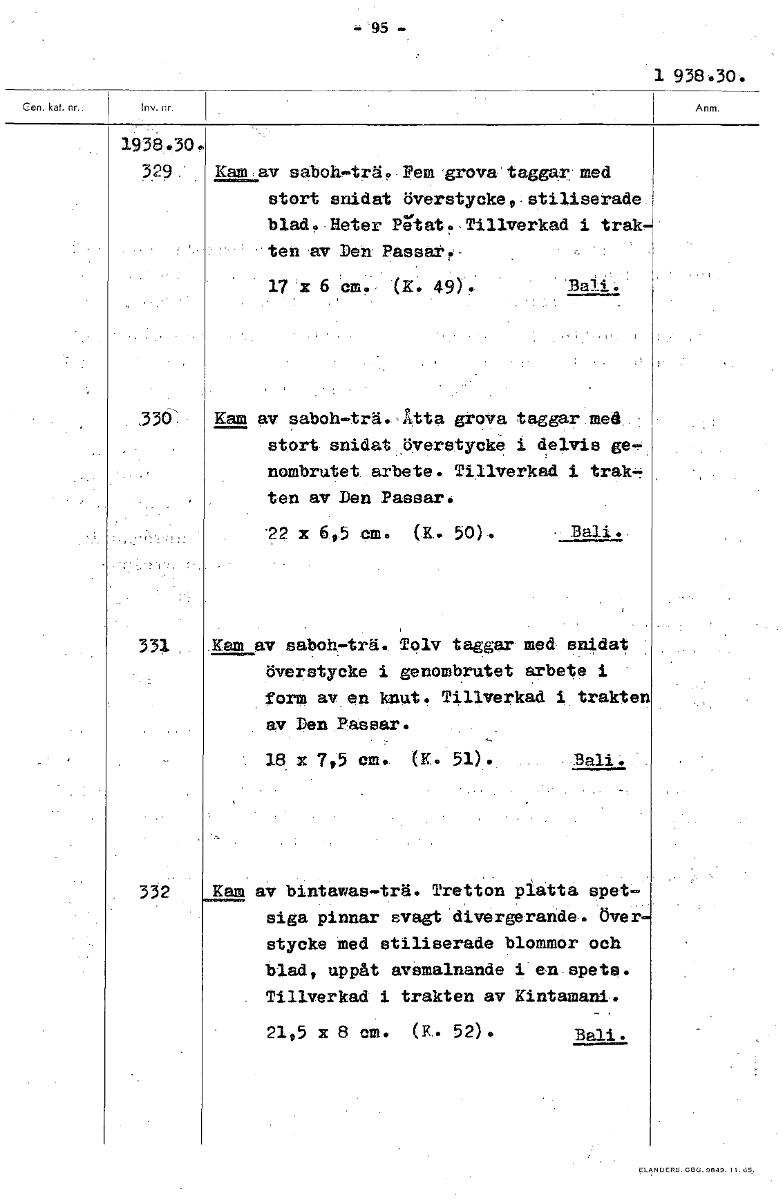 • 95- 1 938.30. 1938.30. 329 Kam av saboh-trä.. Fem grova' taggar med stort snidat överstycke, stiliserade blad. Heter Pgtat. Tillverkad i trak ten av Den' Passar.- 17 x 6 cm. (K. 49). ,330 Kam av saboh... Visa hela