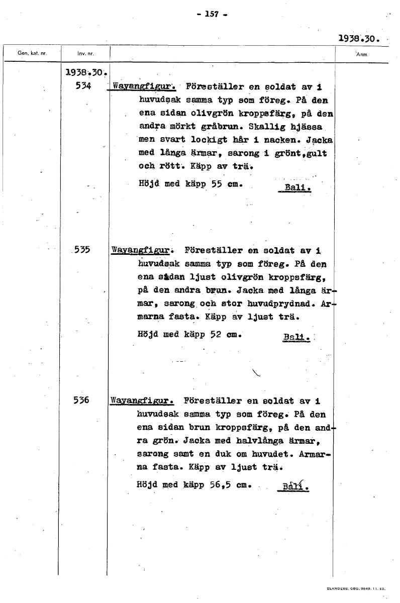 157 1938.30. 1938•30. 534 a anr . i ur. Föreställer en soldat av 1 huvudsak samma typ som föreg.. På den ena sidan olivgrön kroppsfärg, på den andra mörkt gråbrun. Skallig hjässa man svart lockigt hår...