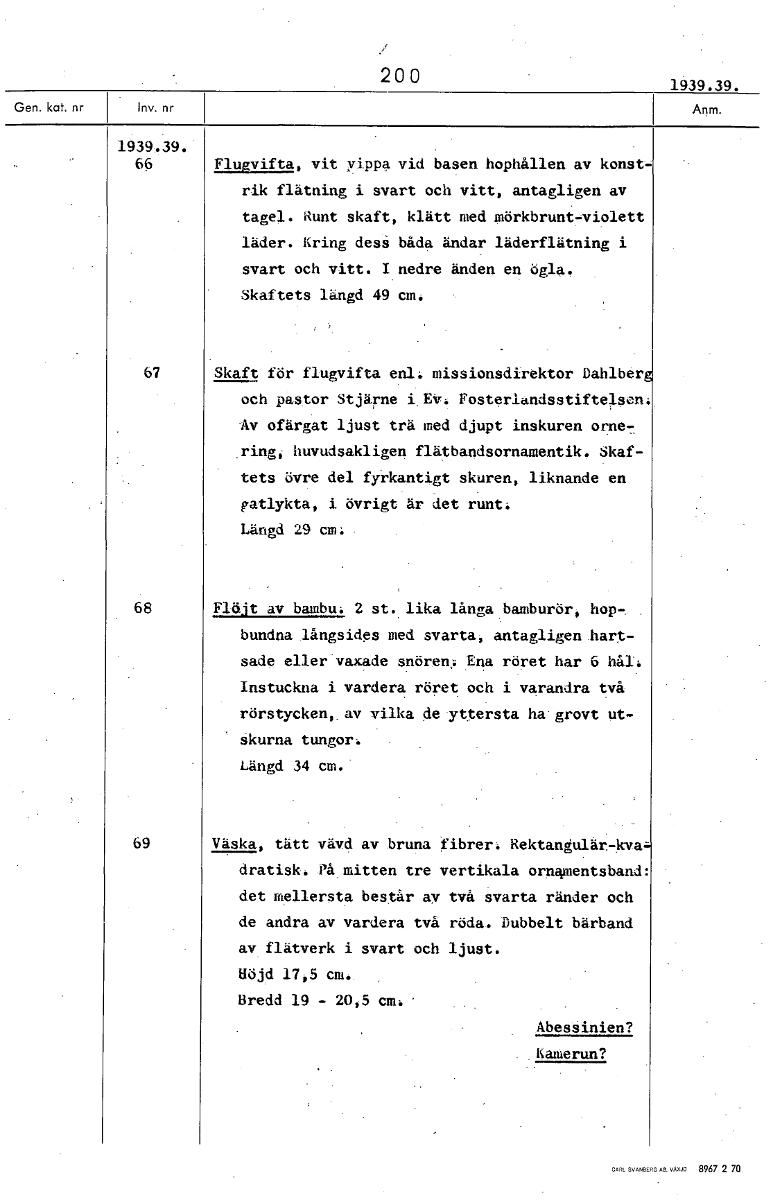 200 1939.39. 1939.39. 66 Flugvifta, vit yippa vid basen hophållen av konst- rik flätning i svart och vitt, antagligen av tagel. Runt skaft, klätt med mörkbrunt-violett läder. Kring deså båda ändar läderflätning i svart och vitt. I nedre änden en ögla. Skaftets längd 49 cm. 67 Skaft för flugvifta enl: missionsdirektor dahlbar och pastor Stjärne i.EV. Fosterlandsstiftelsen: Av ofärgat ljust trä med djupt inskuren orne77, ying, huvudsakligen flätbandsornamentik. Skaf- tets övre del fyrkantigt skuren, liknande en gatlykta, i övrigt är det runt. Längd 29 cm: 68 Flöjt av bambu. 2 st. lika långa bamburör, hop-. bundna långsides med svarta, antagligen hart- sade eller vaxade snören:: Ena röret har 6 hål". Instuckna i vardera röret och i varandra två rörstycken,. av vilka de yttersta ha grovt ut- skurna tungor: Längd 34 cm. 69 Väska, tätt vävd av bruna fibrer. Rektangulär-kva dratisk. På mitten tre vertikala ornamentsband: det mellersta består av två svarta ränder och de andra av vardera två röda. Dubbelt bärband av flätverk i svart och ljust. Böjd 17,5 cm. Bredd 19 - 20,5 cm: • Abessinien? Kamerun? [ocr]